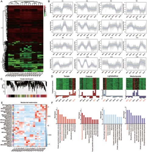 接下來,根據(jù)RNA-seq數(shù)據(jù)鑒定了7101個DEGs,占本研究鑒定的所有基因的14.63% (7,101/48,549)。這些DEGs的熱圖表現(xiàn)出兩個保守組,如在干旱脅迫下誘導和抑制根和葉的表達模式(圖6 A)。然后使用K-means算法進行富集分析,得到16個聚類(K1-K16)(圖6 B)。在SD條件下,K12、K13和K16基因主要在葉片和根中表達,表明它們可能參與干旱脅迫。而在MD和SD處理下,K4、K5、K7、K9和K11基因在根和葉中均受到抑制。