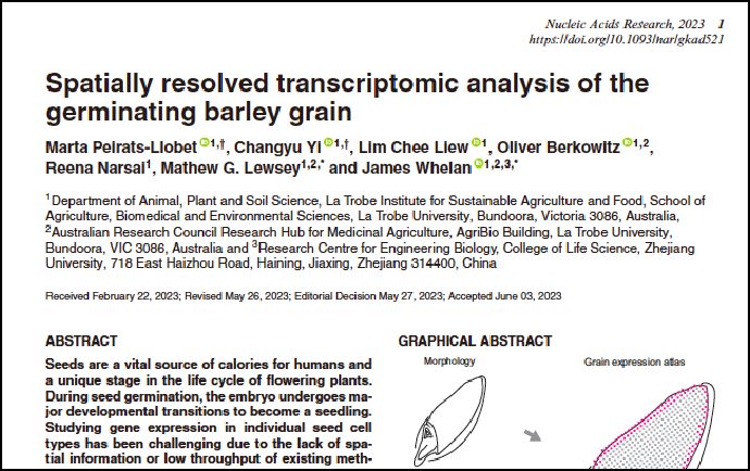 研究開(kāi)發(fā)了大麥種子萌發(fā)過(guò)程的空間轉(zhuǎn)錄組學(xué)流程,通過(guò)進(jìn)行高通量的空間基因表達(dá)分析,揭示了不同功能基因類別在亞組織水平上的特定空間表達(dá)模式,為大麥萌發(fā)提供了空間解析細(xì)胞圖,并確定了特定的功能基因組目標(biāo),以更好地理解萌發(fā)過(guò)程中的細(xì)胞限制過(guò)程。