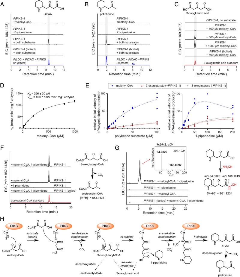 為了更好地了解這種亞胺-酮縮合的機(jī)制,獲得了兩種PtPIKS同源基因的純化蛋白用于體外分析。與我們?cè)诒臼綗煵葜械慕Y(jié)果一致,當(dāng)添加 1-哌啶和丙二酰輔酶 A 作為底物時(shí),PtPIKS-1和PtPIKS-2在體外測(cè)定中都產(chǎn)生了4PAA和pelletierine(圖4 A和B),此外還有其他幾種未知化合物。雖然當(dāng)單獨(dú)孵育 1-哌啶作為底物時(shí)沒(méi)有觀察到明顯的產(chǎn)物,但僅向PtPIKS-1添加丙二酰輔酶 A 會(huì)導(dǎo)致 3-氧代戊二酸的積累(圖 4 C 和 D)。3-氧代戊二酸的積累表明,PIKS能夠催化兩個(gè)丙二酰輔酶A單元縮合成硫酯連接的3-氧代谷氨酰基團(tuán),并且該聚酮酸從硫酯鍵上酶促或非酶水解。