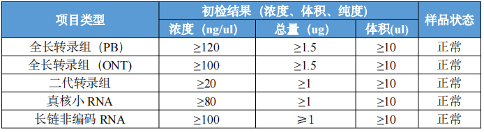 2、以上均是單個文庫的總量要求,如果樣品做多個文庫按(小 RNA>LNCRNA>轉(zhuǎn)錄組 RNA)判??偭坎蛔愕奈膸煊袠悠放?C 不通過,無不合格原因,根據(jù)二次提取的總量判定。無樣品根據(jù)剩余總量判判定下一文庫。