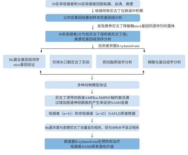 吸煙是人類最常見(jiàn)的不健康行為之一,世界衛(wèi)生組織將吸煙列為可預(yù)防死亡的主要原因。戒煙是延長(zhǎng)預(yù)期壽命的最有效方法,但由于尼古丁的強(qiáng)大成癮性和戒斷癥狀,戒煙并不容易實(shí)現(xiàn)。尼古丁降解最近被認(rèn)為是阻斷尼古丁誘發(fā)的病理的一種策略。NAFLD(非酒精性脂肪肝病)包含廣泛的病理,通常從簡(jiǎn)單的脂肪變性發(fā)展為NASH(非酒精性脂肪性肝炎),然后在某些情況下發(fā)展為肝硬化和肝癌。由于腸道產(chǎn)生的代謝物在通過(guò)腸-肝軸的NAFLD進(jìn)展中具有關(guān)鍵作用,因此建立腸道尼古丁積累、腸源性代謝物和NAFLD進(jìn)展之間的關(guān)系可以為吸煙相關(guān)的肝臟疾病提供新的線索。