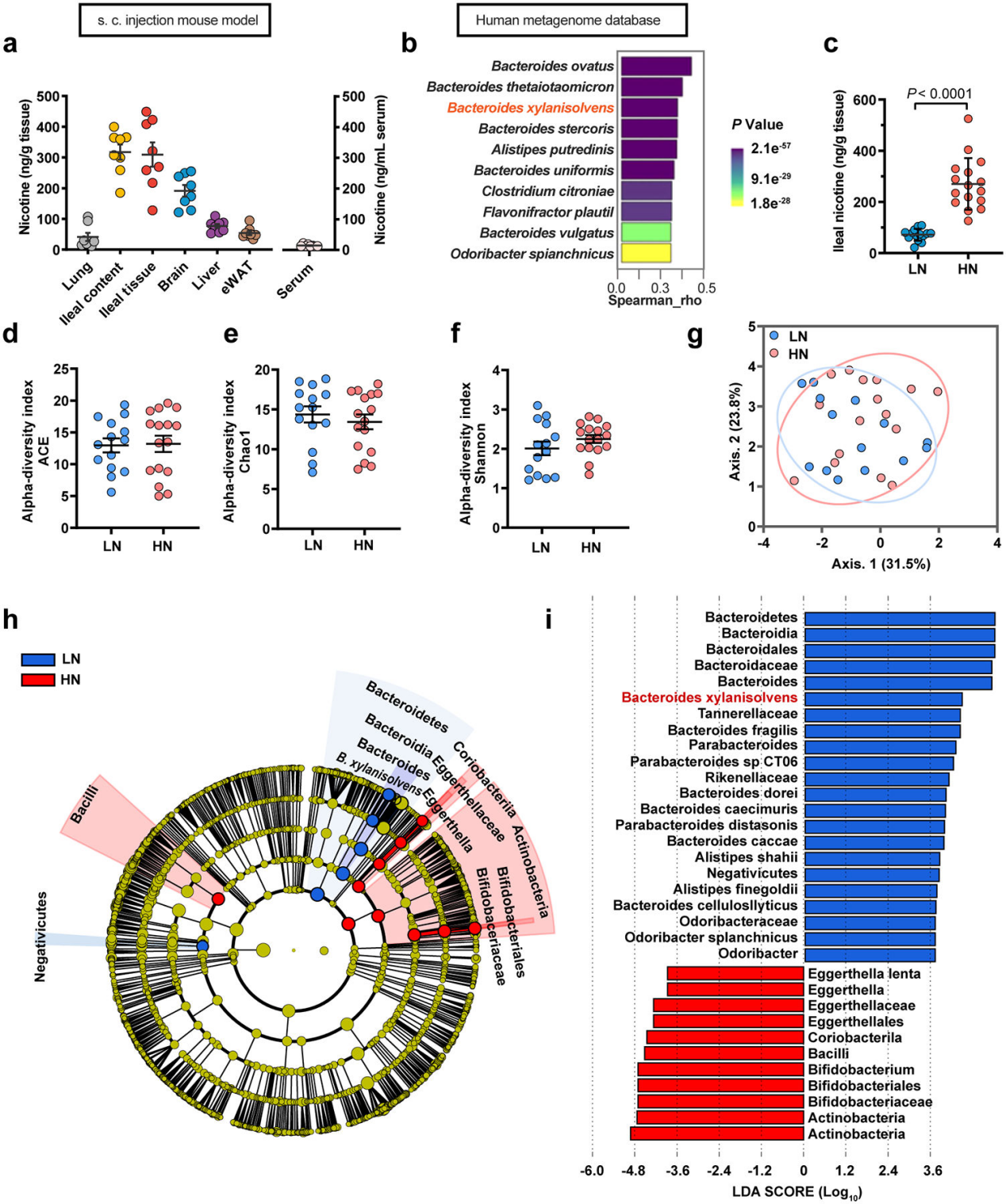 在吸煙者的回腸粘膜組織中檢測(cè)到高水平的尼古丁,表明在吸煙期間尼古丁會(huì)在腸道中積聚(圖1a)。內(nèi)源性腸道細(xì)菌有助于尼古丁的降解(圖1C)。從公共宏基因組數(shù)據(jù)庫(kù)中篩選攜帶已知尼古丁分解代謝基因的潛在菌株。在幾個(gè)菌株中發(fā)現(xiàn)了nicA基因(一種已知的尼古丁降解酶)的同源序列,表明這些菌株具有降解尼古丁的潛力。宏基因組學(xué)分析發(fā)現(xiàn)B.xylansolvens可能含有尼古丁分解代謝基因,并被鑒定為與LN和HN組之間的分離相關(guān)的主要驅(qū)動(dòng)因素(圖1D),B.xylansolvensnicX存在的情況下具有降解尼古丁的能力。