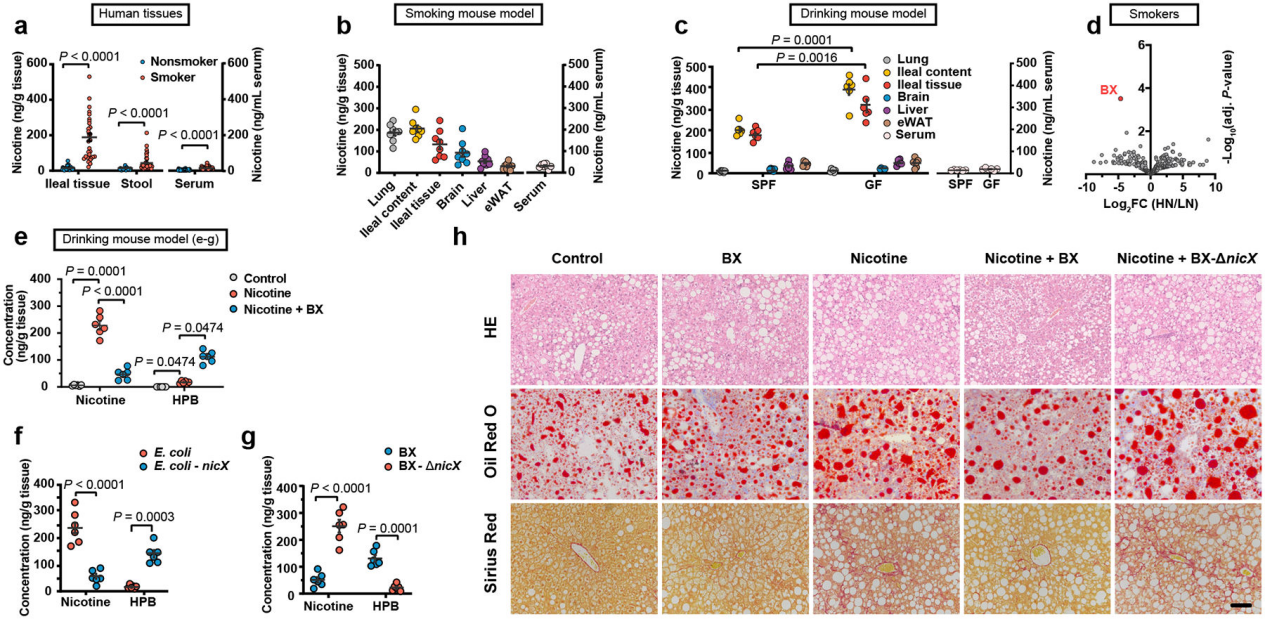 該研究發(fā)現(xiàn)尼古丁在吸煙期間在腸道中積聚并加速NAFLD的進(jìn)展,但它可以被人類共生菌B.xylansolvens有效降解。揭示了了腸道尼古丁積累的病理影響,并確定了一種內(nèi)源性尼古丁降解腸道細(xì)菌,該細(xì)菌對(duì)預(yù)防和治療吸煙者的NASH具有潛在價(jià)值。