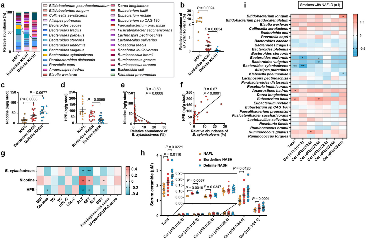 收集了83名經(jīng)活檢診斷為NAFLD患者的微生物數(shù)據(jù),將患者分為吸煙者(n=41)和非吸煙者(n=42)。這B.xylansolvens介導(dǎo)的尼古丁降解可能保護(hù)吸煙者的肝功能。NASH患者的血清神經(jīng)酰胺水平,尤其是主要來(lái)自腸道的神經(jīng)酰胺(D18:1/16:0)水平顯著高于NAFL患者(圖4h),并與B.xylansolvens的豐度呈負(fù)相關(guān)(圖4l)。綜上所述,腸道尼古丁蓄積是吸煙者臨床NAFLD進(jìn)展的危險(xiǎn)因素,同時(shí)也表明具有尼古丁降解活性的B.xylansolvens具有保護(hù)作用。