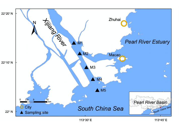 • 從M1到M5的采樣點鹽度升高,每對采樣點之間有顯著差異(P < 0.05);