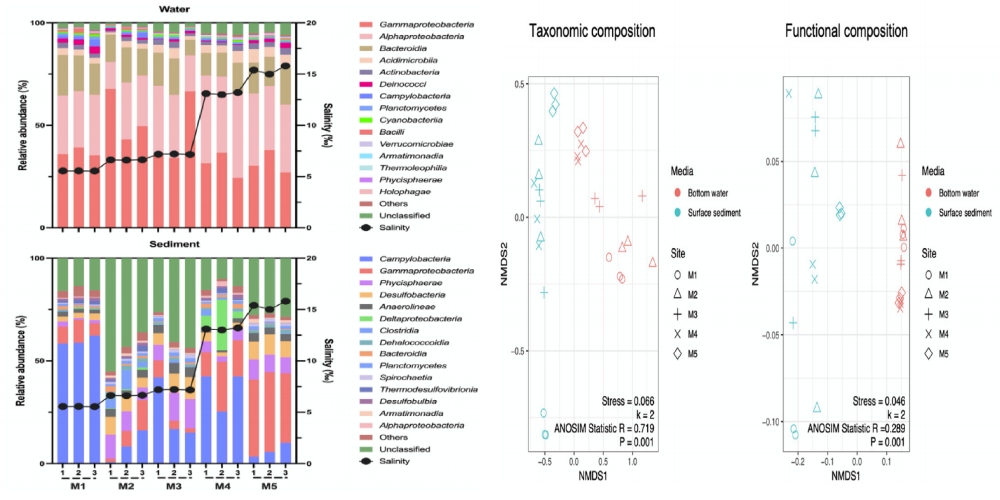 • 由于SWI對沉積細菌群落有主要影響,對M1(低鹽度)和M5(高鹽度)進行了宏基因組測序。通過NMDS分析,沉積物細菌群落的病灶組成清晰分離;