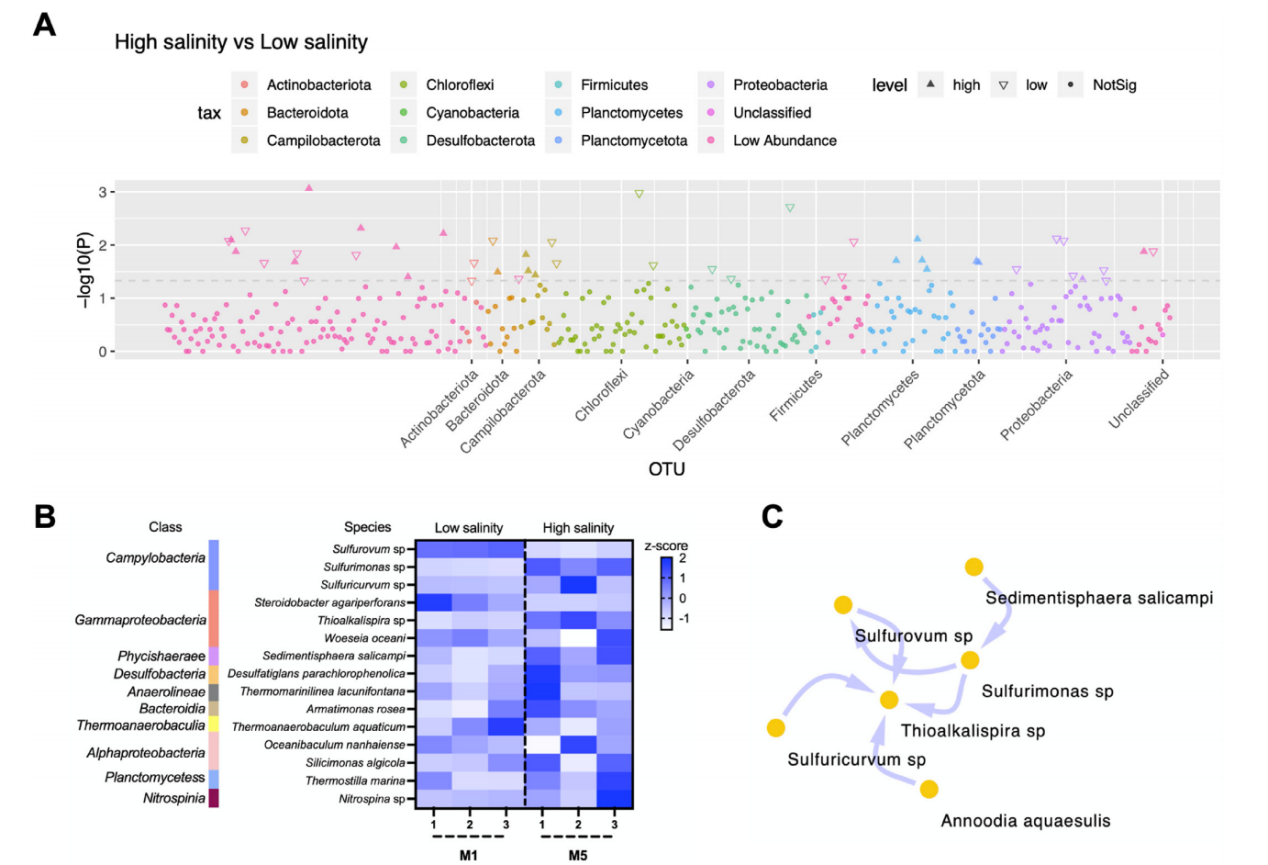 • 沉積性細菌群落中最豐富的15個細菌OTUs來自10個類別,其中彎曲桿菌和伽馬變形菌門是最重要的類群,各有3種。與此同時,有11個物種在高鹽度中富集,包括硫脲、硫單胞菌、彎曲桿菌、硫堿桿菌、熱厭氧菌等;
