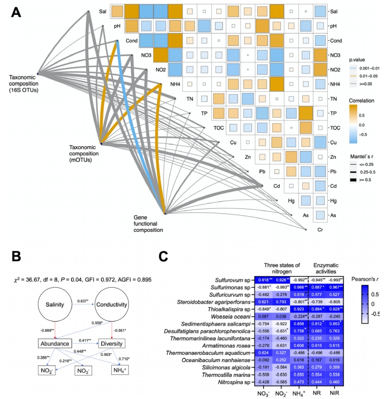 • 鹽度、電導率和細菌豐度之間存在正相關關系,沉積物中不同的氮形態(tài)有順序的參與;