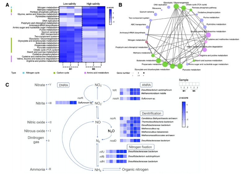 • 功能基因通過KEGG途徑富集的結果表明,氮代謝相關功能基因在高鹽環(huán)境下的表達水平高于低鹽環(huán)境,而碳和氨基酸代謝相關功能基因在低鹽環(huán)境下的表達水平高于高鹽環(huán)境。這表明SWI通過建立鹽度梯度刺激氮循環(huán);