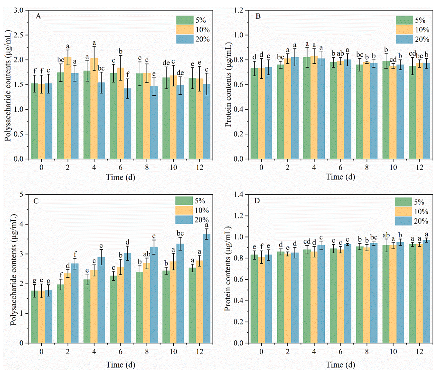 圖4-不同濃度PMW處理下LB-EPS (A、B)和TB-EPS (C、D)的蛋白質(zhì)和多糖含量