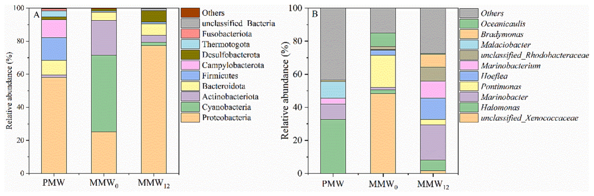 為了進(jìn)一步明確細(xì)菌在系統(tǒng)中的作用,在門(mén)和屬水平上的10個(gè)優(yōu)勢(shì)分類(lèi)群如圖5A和5B所示。Proteobacteria豐度在PMW中達(dá)到58%,與C. muelleri在MMW12共培養(yǎng)條件下增加到77%。變形桿菌中含有多種促進(jìn)氮轉(zhuǎn)化和有機(jī)物降解的功能菌株。此外,與PMW相比,MMW12組放線菌和藍(lán)藻菌的豐度也有所增加。