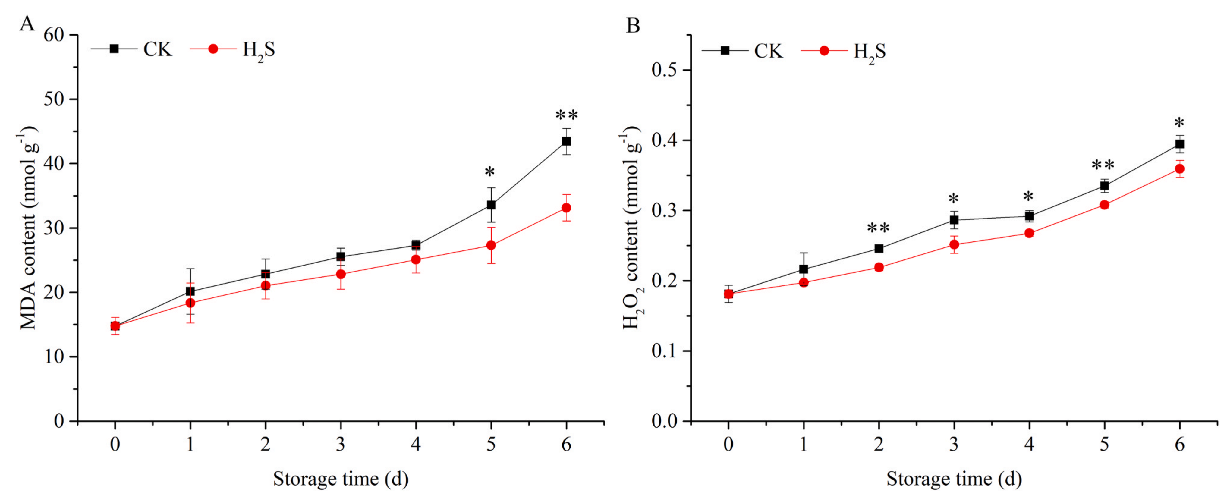 對(duì)比3.2 mM NaHS處理和未處理的黃花菜MDA含量,結(jié)果顯示,貯藏6 d內(nèi),CK和H2S處理組MDA含量均持續(xù)升高。貯藏4 d后,H2S處理顯著抑制了MDA含量的增加。H2S處理的黃花菜在貯藏過(guò)程中H2O2的產(chǎn)生被阻斷。