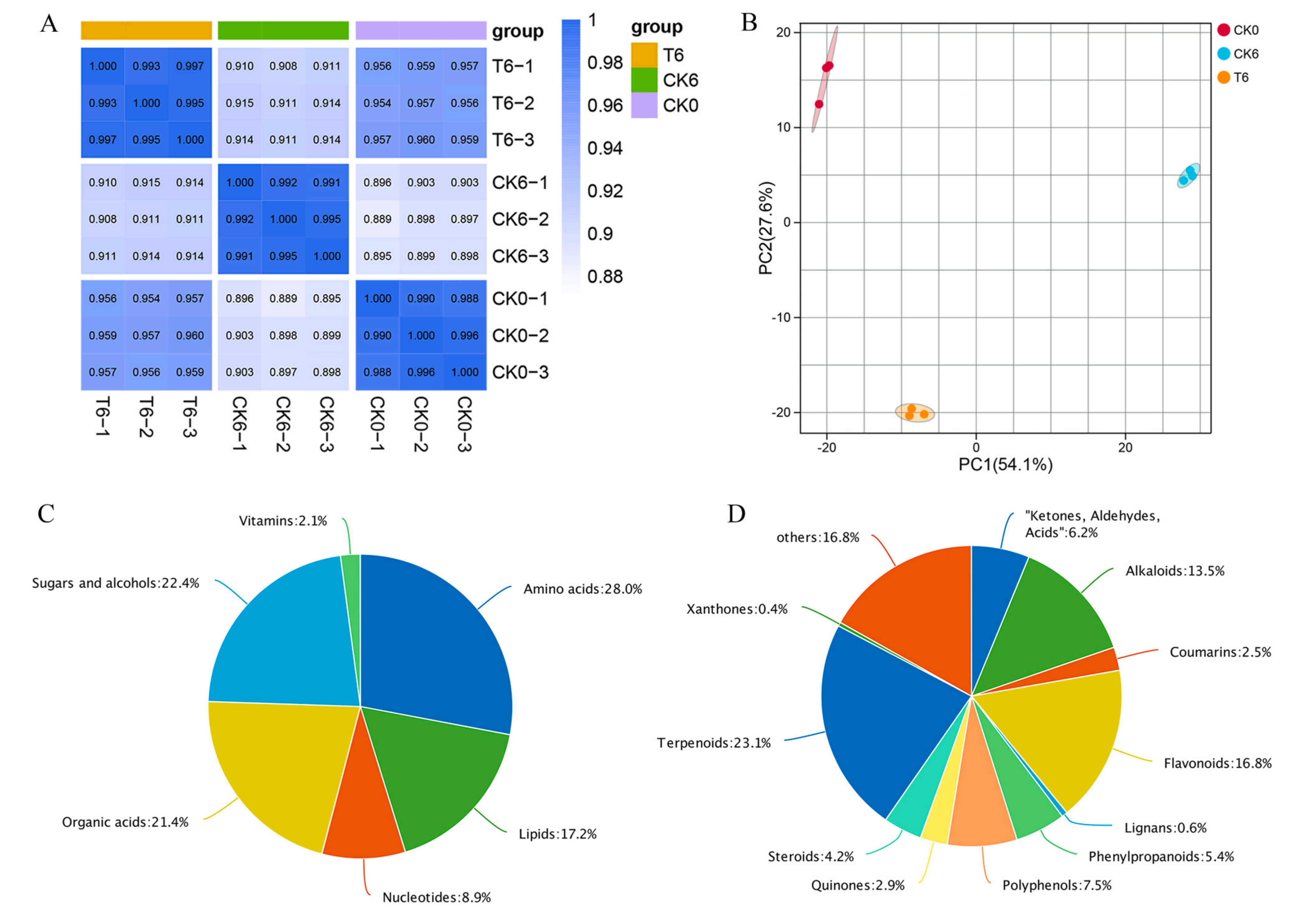 為了進(jìn)一步研究H2S對(duì)黃花菜貯藏過(guò)程中品質(zhì)的調(diào)控機(jī)制,利用植物廣靶代謝組學(xué)方法分析了NaHS處理后黃花菜代謝產(chǎn)物的變化。共鑒定了910種代謝物,包括429種初級(jí)代謝物和481種次生代謝物,分別為氨基酸、糖和醇、有機(jī)酸、脂質(zhì)、核苷酸、維生素、萜類、黃酮類、生物堿、多酚、“酮類、醛類、酸類”、苯丙素、類固醇、醌類、香豆素、木脂素和山酮。PCA分析顯示,CK0, CK6和T6三組在代謝水平上存在差異。