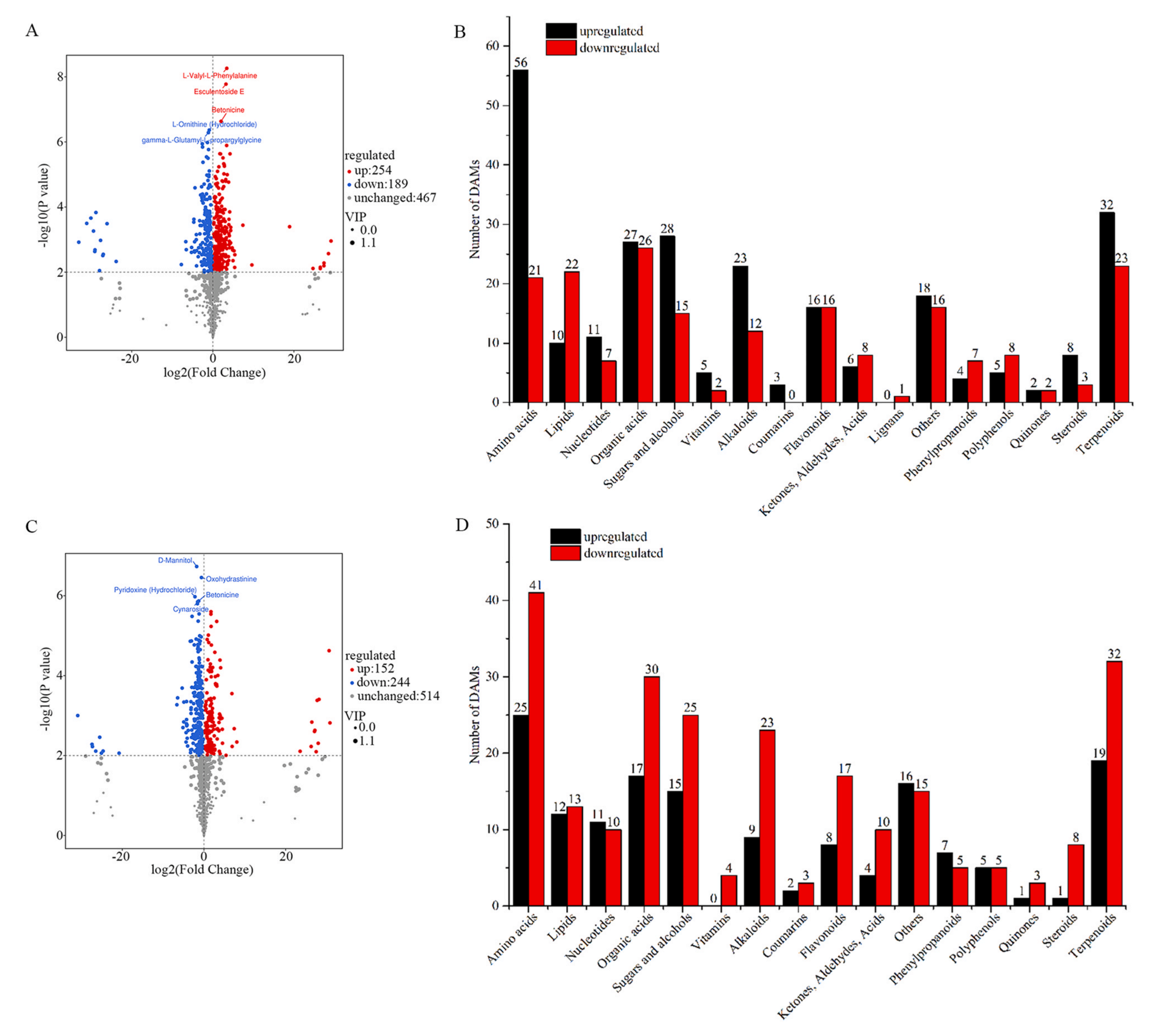 根據(jù)FC > 1、P < 0.05和VIP > 1的篩選標(biāo)準(zhǔn),在CK0和CK6之間共鑒定出443個(gè)DAMs。其中,254種代謝物在CK0中上調(diào),189種代謝物下調(diào)。這些DAMs代表了衰老黃花菜的主要成分變化,可分為17類,包括230種初級(jí)代謝物和213種次級(jí)代謝物。包括56種氨基酸、10種脂類、11種核苷酸、27種有機(jī)酸、28種糖和醇類、5種維生素、23種生物堿、3種香豆素、16種黃酮類、6種酮類、醛類、酸類、4種苯丙素、5種多酚類、2種醌類、8種類固醇、32種萜類和18個(gè)其他類。對(duì)于下調(diào)代謝物,鑒定了93種氨基酸(21種)、脂質(zhì)(22種)、核苷酸(7種)、有機(jī)酸(26種)、糖和醇(15種)、維生素(2種)的初級(jí)代謝物,以及96種生物堿(12種)、類黃酮(16種)、酮類、醛類、酸類(8種)、木脂素(1種)、苯丙素(7種)、多酚類(8種)、醌類(2種)、類固醇(3種)、萜類(23種)和其他(16種)的次級(jí)代謝物。KEGG富集分析表明,DAMs與氨基?;? tRNA生物合成、乙醛酸鹽和二羧酸鹽代謝、精氨酸生物合成、D -氨基酸代謝、丙氨酸、天冬氨酸和谷氨酸代謝密切相關(guān)。