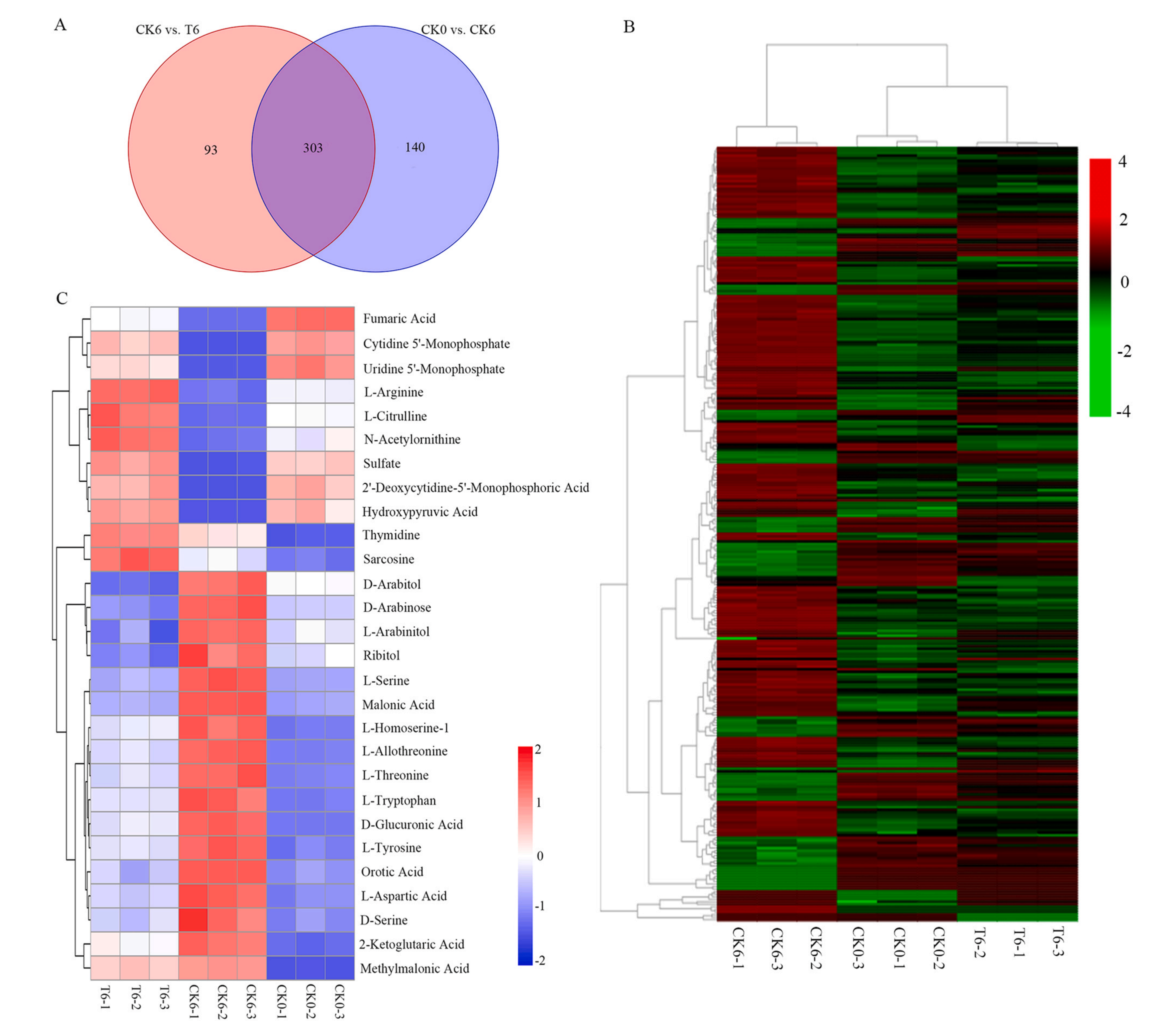 CK6和T6積累的差異代謝物表明H2S處理具有顯著影響。在396個(gè)顯著改變的DAMs中,152個(gè)上調(diào),244個(gè)下調(diào)。氨基酸(66),有機(jī)酸(47),糖和醇(40),脂質(zhì)(25),核苷酸(21)和維生素(4),萜類(51),生物堿(32),類黃酮(25),酮類,醛類,酸類(14),苯丙素(12),多酚(10),類固醇(9),香豆素(5),醌類(4),其他類(31)。這些DAMs主要與甘油磷脂代謝、嘧啶代謝、戊糖、甘氨酸、絲氨酸和蘇氨酸代謝有關(guān)。
