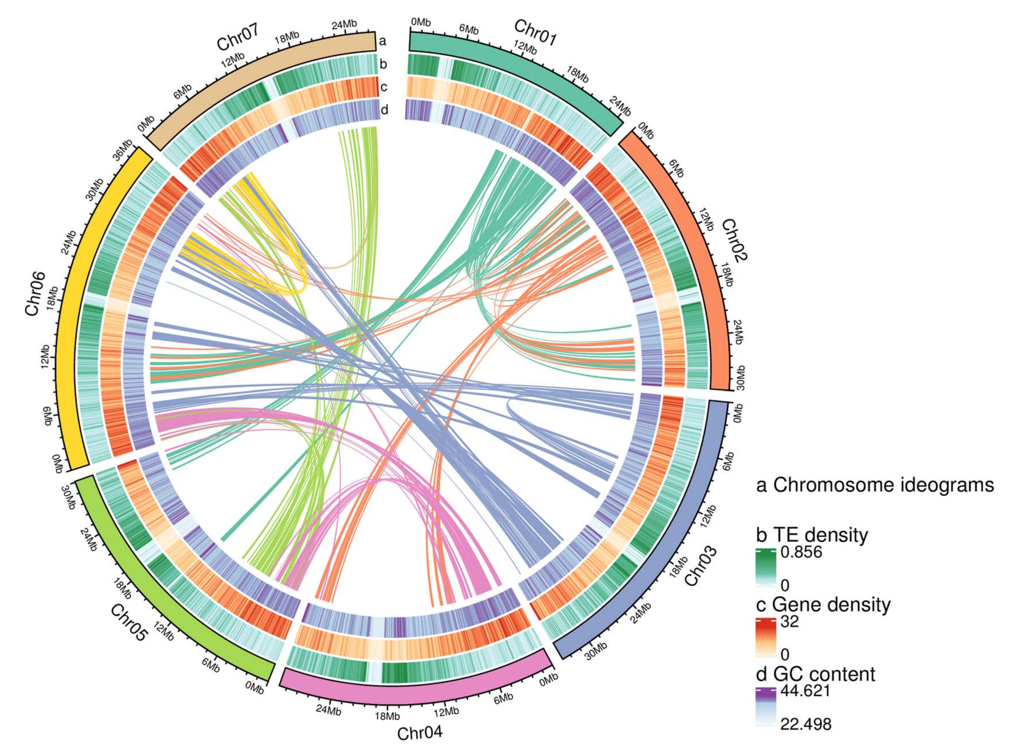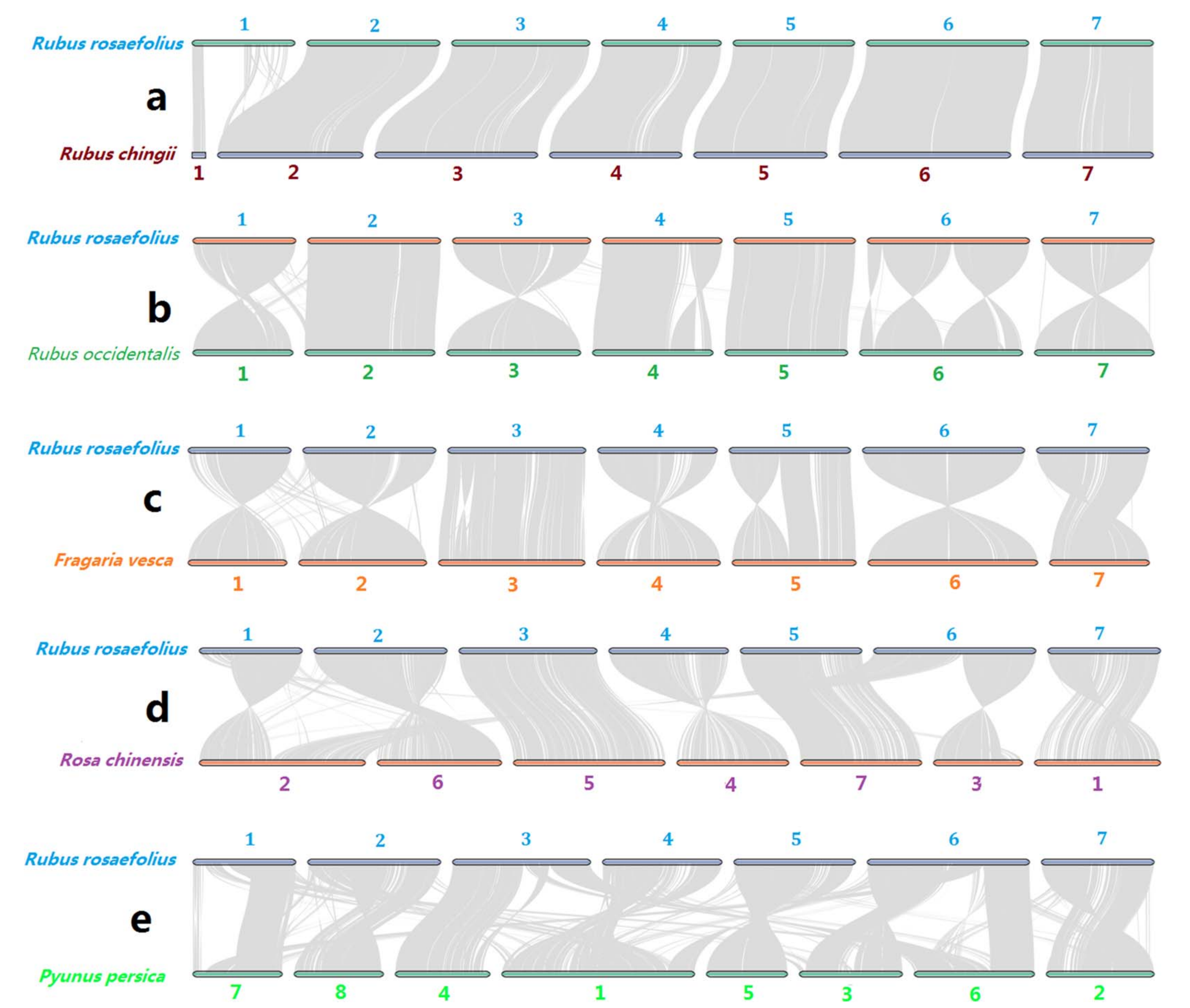所有的植物都有一個(gè)或遠(yuǎn)或近的共同祖先。通過(guò)共線(xiàn)性分析發(fā)現(xiàn):在1號(hào)染色體的一端和其他6條染色體上,發(fā)現(xiàn)了完整且平行的同源物,但在1號(hào)染色體的另一端缺失了大同源塊(圖3a)。這些結(jié)果表明,空心藨和紅覆盆子之間沒(méi)有發(fā)生大的染色體變異,但在空心藨和紅覆盆子基因組草圖的組裝或注釋中隱藏了錯(cuò)誤。該研究發(fā)現(xiàn),空心藨和紅覆盆子之間所有染色體的共線(xiàn)性幾乎是完整的(圖3b),這表明上述1號(hào)染色體的組裝或注釋錯(cuò)誤可能在空心藨中沒(méi)有發(fā)生。當(dāng)忽略單倍型中支架組裝方向的干擾時(shí),1、2、3、5、7號(hào)染色體幾乎完全平行共線(xiàn)性,4號(hào)染色體可能發(fā)生較大反轉(zhuǎn),6號(hào)染色體可能發(fā)生3次或更少的反轉(zhuǎn)(圖3b)。這些發(fā)現(xiàn)表明,隨著親緣關(guān)系距離的增加,復(fù)雜染色體變異的數(shù)量增加。