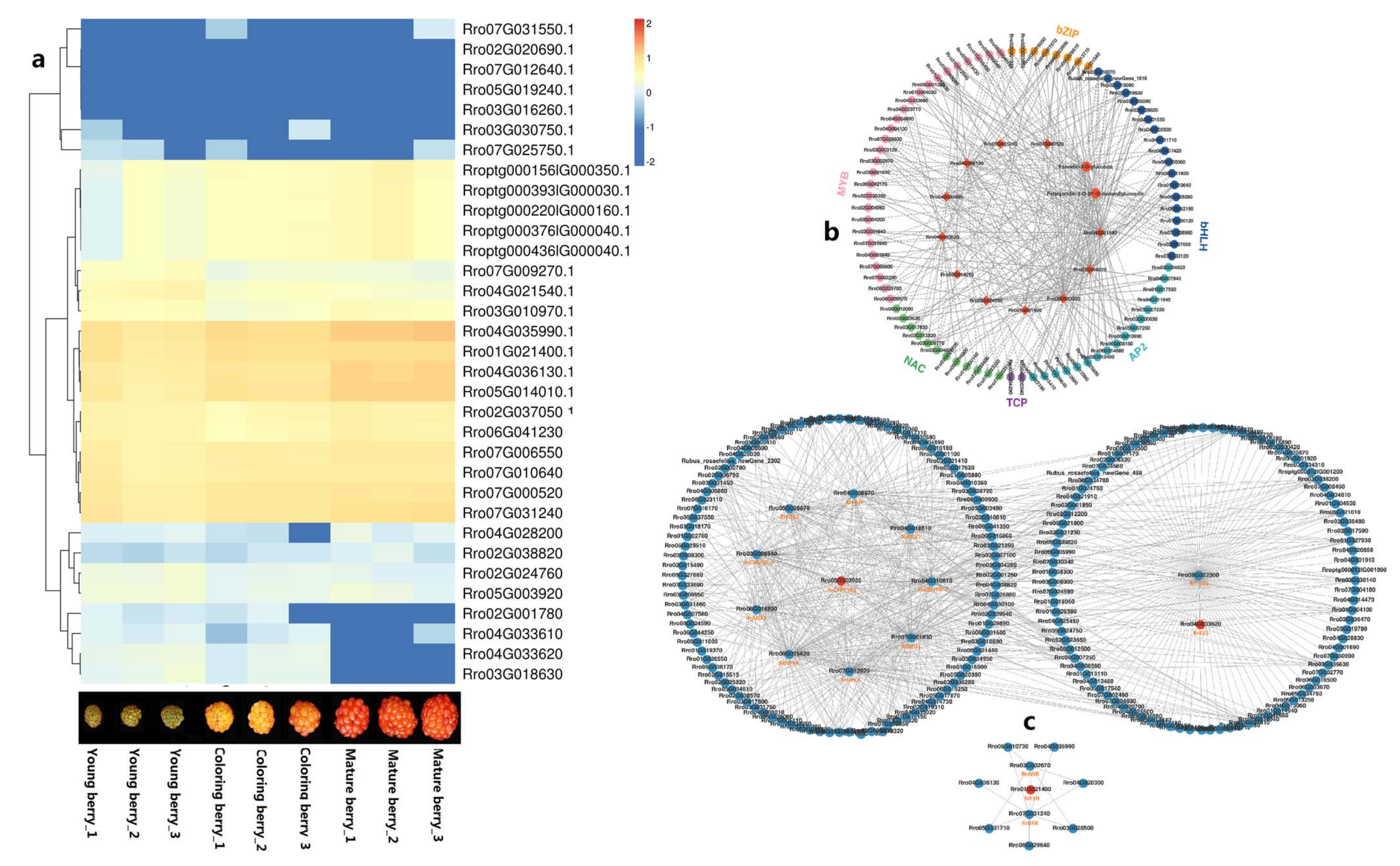 為了探索空心藨紅漿果中花青素生物合成調(diào)控的分子機(jī)制,該研究對(duì)空心藨紅漿果幼齡期和成熟期的轉(zhuǎn)錄組和代謝組進(jìn)行了相關(guān)性分析。在成熟漿果中發(fā)現(xiàn)的主要花青素——芍藥苷-3-O-葡萄糖苷和芍藥苷-3-O-(6’’-O-丙二?;?葡萄糖苷被鑒定為顯著差異積累代謝產(chǎn)物(DAMs),其中11個(gè)結(jié)構(gòu)基因被發(fā)現(xiàn)為差異表達(dá)基因(DEGs)。其中,Rro07G000520.1 (RrBZ1)、rro07g035990.1和rro07g036130.1 (RrCHS)、rro07g06550.1 (RrCHI)、rro07g021400.1 (RrF3H)、Rro07G031240.1 (RrDFR)和Rro05G014010.1 (RrANS)與芍藥苷-3-O-葡萄糖苷積累呈正相關(guān),而Rro07g033620.1、Rro07g024760.1 (RrBZ1)、Rro07G009270.1 (RrUGT75C1)、Rro04G021540.1 (RrUGT79B1)與這兩種物質(zhì)呈負(fù)相關(guān)(圖6b)。編碼屬于MYB、bHLH、AP2、bZIP、NAC和TCP家族轉(zhuǎn)錄因子的幾個(gè)DEGs的表達(dá)與上述一個(gè)或多個(gè)結(jié)構(gòu)基因和兩個(gè)DEGs呈顯著正相關(guān)或負(fù)相關(guān)(圖6b)。這些發(fā)現(xiàn)表明轉(zhuǎn)錄因子廣泛參與了空心藨花青素生物合成的調(diào)控。通過(guò)蛋白-蛋白相互作用(PPI)分析,該研究發(fā)現(xiàn)Rro4G033620蛋白(RrBZ1)與三甲基鳥(niǎo)苷合成酶1 (RrTGS1)直接相互作用,Rro5G003920蛋白(RrBZ1)直接與鐵氧還蛋白C1 (RrFDX1)、CCAAT結(jié)合轉(zhuǎn)錄因子(RrNFYA)、谷氨酸合成酶1 (RrGLU1)和組蛋白樣轉(zhuǎn)錄因子(RrCBF/NF-Y)相互作用,Rro1G021400蛋白(RrF3H)直接與RrFDR和RrANR相互作用(圖6c)。上述結(jié)果表明,空心藨花青素的合成受RNA甲基化、結(jié)構(gòu)基因編碼蛋白和轉(zhuǎn)錄因子的相互作用調(diào)控。