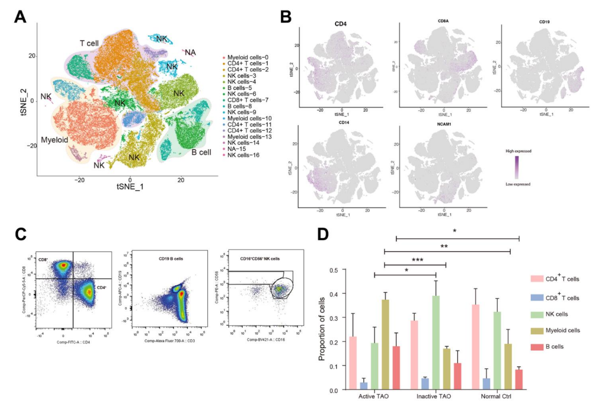 該研究使用10x Genomics Chromium平臺(tái)對(duì)總共9個(gè)樣本進(jìn)行了scRNA-seq。經(jīng)過(guò)初步質(zhì)量控制后,總共獲得了93,007個(gè)PBMC用于后續(xù)分析,其中包括來(lái)自活性TAO的23,051個(gè)細(xì)胞、來(lái)自非活性TAO的34797個(gè)細(xì)胞和來(lái)自正常對(duì)照 (NC) 的35,159個(gè)細(xì)胞?;趫D的聚類分析確定了17個(gè)不同的聚類。在手動(dòng)確認(rèn)細(xì)胞類型注釋后,該研究成功將簇分為五種主要的PBMC細(xì)胞類型。其中包括各種CD4+ T細(xì)胞群 (CD4+)、NK (CD56+)、CD8+T細(xì)胞 (CD8A+)、B細(xì)胞 (CD19+) 和骨髓細(xì)胞 (CD11b+)(圖1A,1B)。通過(guò)流式細(xì)胞術(shù)分析驗(yàn)證了scRNA-seq鑒定的這五種細(xì)胞類型的存在(圖1C)。值得注意的是,17個(gè)細(xì)胞簇中的12個(gè) (70.6%) 包含來(lái)自多個(gè)單獨(dú)樣本的至少100個(gè)細(xì)胞,每個(gè)簇內(nèi)平均有9個(gè)單獨(dú)樣本。