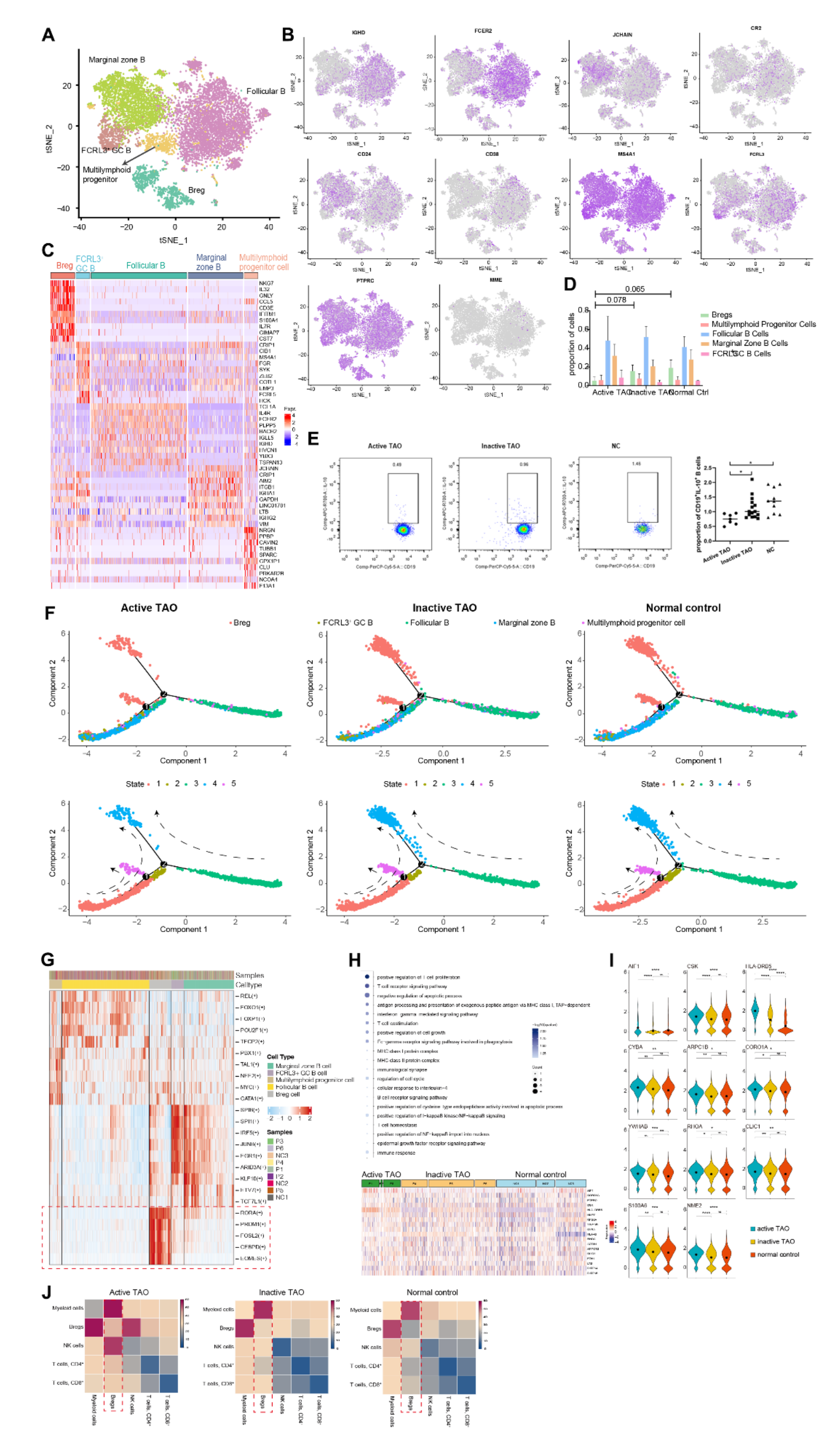 隨后檢查了疾病不同階段每個(gè)樣本中的B細(xì)胞組成。雖然三組的Bregs相對(duì)比例沒(méi)有顯著差異,但與非活動(dòng)TAO組和正常對(duì)照組相比,活動(dòng)TAO中的Bregs比例較低(p=0.078和p=0.065)(圖2D)。盡管觀察到的差異未達(dá)到統(tǒng)計(jì)顯著性,但這一結(jié)果表明了數(shù)據(jù)的潛在趨勢(shì)。為了驗(yàn)證這些結(jié)果,該研究進(jìn)行了流式細(xì)胞術(shù)分析,并使用CD19+IL-10+作為識(shí)別Bregs細(xì)胞群的標(biāo)記。IL-10由于其抑制促炎癥反應(yīng)的能力而被廣泛認(rèn)為是Breg的標(biāo)志。該分析證實(shí),與非活動(dòng)TAO和NC組相比,活動(dòng)TAO中的Breg頻率降低(圖2E)。