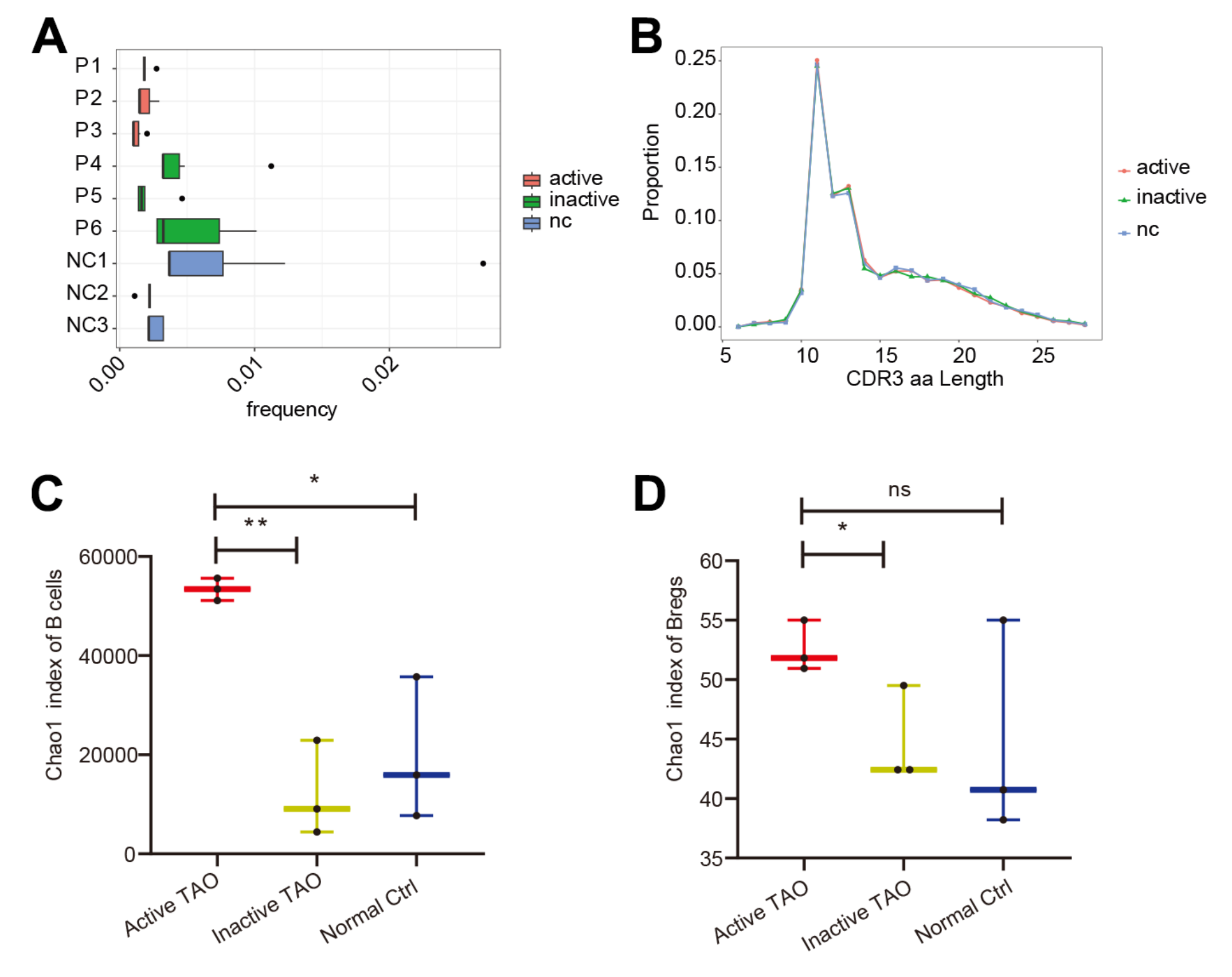 為了全面分析B細(xì)胞群中的基因表達(dá)和BCR多樣性,該研究對(duì)scRNA-seq分析中使用的PBMC樣本進(jìn)行了scBCR-seq。在活性TAO中,前10個(gè)克隆型的比例(0.17%)與非活性組(0.37%,p=0.010)和NC組(0.41%,p=9.31E-05)(圖3A)。然而,對(duì)互補(bǔ)決定區(qū)3 (CDR3) 長(zhǎng)度的分析沒(méi)有顯示任何明顯的變化(圖3B)。當(dāng)檢查CDR3的多樣性時(shí),通過(guò)Chao1指數(shù)量化,與NC組 (p=0.016) 和非活動(dòng)TAO組 (p=0.002) (圖3C)。Breg細(xì)胞中也出現(xiàn)了類似的趨勢(shì)(圖 3D),與NC組相比顯著增加(p=0.011),但活性TAO之間沒(méi)有統(tǒng)計(jì)學(xué)顯著差異組和NC組 (p=0.213)。這些發(fā)現(xiàn)表明,雖然活性TAO中前10個(gè)克隆型的頻率降低,但在這種情況下CDR3序列的多樣性增加,這可能對(duì)免疫反應(yīng)的調(diào)節(jié)有影響,并有助于活性TAO的發(fā)病機(jī)制。