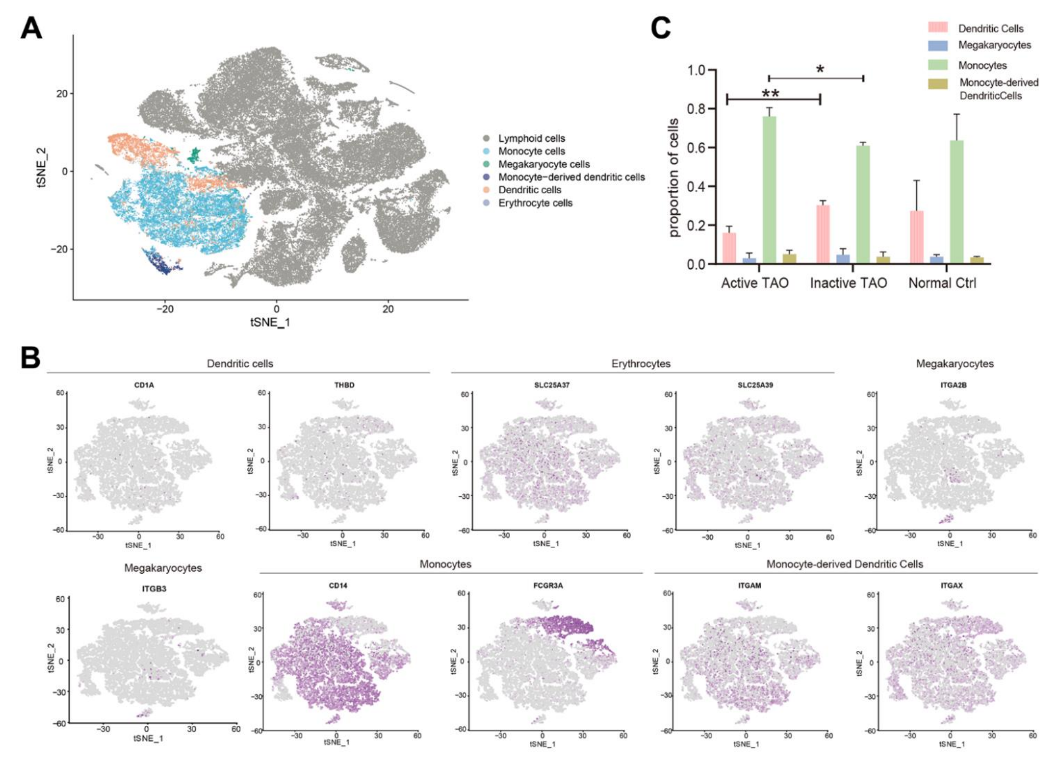 為了評(píng)估骨髓細(xì)胞在TAO中的參與情況,該研究鑒定了骨髓細(xì)胞的主要亞型,并檢查了它們?cè)诨钚訲AO中的配置。分析顯示了五種不同的骨髓細(xì)胞群,即單核細(xì)胞、巨核細(xì)胞、樹突狀細(xì)胞 (DC)、單核細(xì)胞衍生的DC和紅細(xì)胞(圖4A )。這些細(xì)胞類型的鑒定基于差異基因表達(dá)和對(duì)已建立的譜系標(biāo)記的檢查(圖4B)?;钚訲AO 和非活性TAO之間的比較揭示了單核細(xì)胞和DC比例的顯著差異。與非活動(dòng)TAO組相比,活動(dòng)TAO患者的單核細(xì)胞比例顯著較高 (p=0.006),而活動(dòng)TAO中DC的比例顯著較低 (p= 0.003) (圖4C)。這些發(fā)現(xiàn)表明,單核細(xì)胞水平增加和DC數(shù)量減少可能是TAO患者活動(dòng)性疾病狀態(tài)的特征。