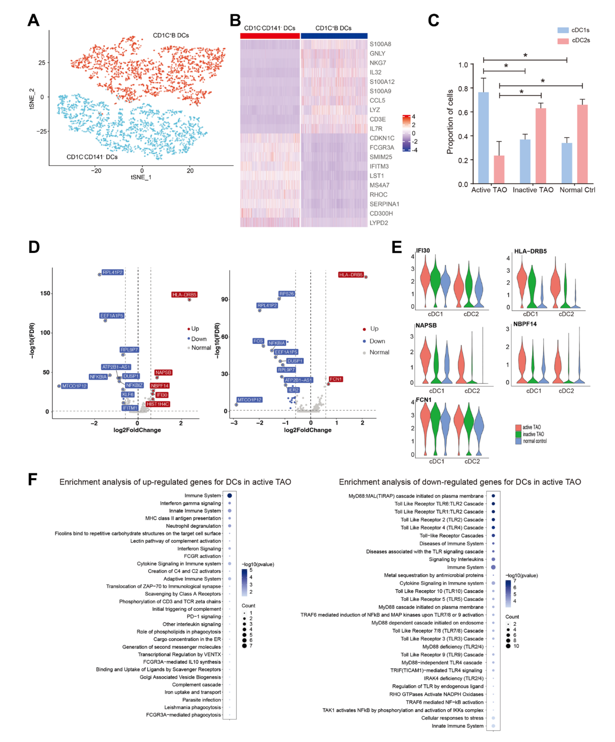 DC被細(xì)分為三個(gè)不同的子簇。Cluster 0被指定為cDC1s,其特征是高表達(dá)CDKN1C、FCGR3A、SMIM25、IFITM3、LST1和MS4A7,以及CD1C和 CD141的低表達(dá)。簇1和簇2被鑒定為cDC2,其炎癥基因的表達(dá)水平升高,例如 CD14、S100A8、GNLY、NKG7 、IL32和S100A12(圖5A、5B)。cDC1s的比例在活性TAO中顯著較高,而cDC2s在非活性TAO和NC中更為普遍(圖 5C)。鑒于cDC1和cDC2在免疫調(diào)節(jié)中發(fā)揮不同的作用- cDC1專門誘導(dǎo)Th2反應(yīng),而cDC2亞群表現(xiàn)出更強(qiáng)大的誘導(dǎo)Th1反應(yīng)的能力[42],該研究進(jìn)一步檢查了它們的基因表達(dá)譜。
