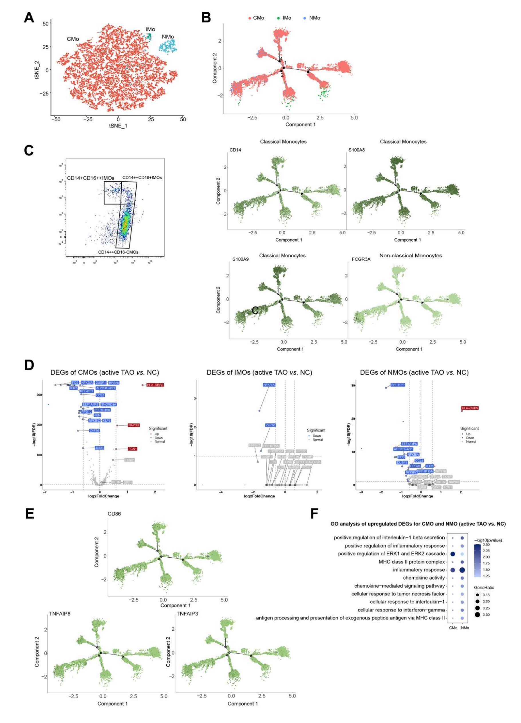 作者的聚類分析成功地從總共 12,959 個(gè)單核細(xì)胞中識(shí)別出三個(gè)不同的亞群。第一個(gè)簇的特征是經(jīng)典單核細(xì)胞 (CMO),其表現(xiàn)出高表達(dá)水平的CD14、S100A8 和 S100A9。第二個(gè)簇被鑒定為非經(jīng)典單核細(xì)胞 (NMO),其特征是高表達(dá)FCGR3A(也稱為 CD16)。第三簇被識(shí)別為中間單核細(xì)胞 (IMO),CD14和FCGR3A均高表達(dá)(圖6A、6B)。為了驗(yàn)證這些單核細(xì)胞亞簇,進(jìn)行了流式細(xì)胞術(shù)分析,確認(rèn) CMO為CD14++CD16-,NMO為CD14+CD16++,IMO為CD14++CD16+(圖6C)。軌跡推斷分析表明,單核細(xì)胞遵循從CMO開(kāi)始并向NMO和IMO狀態(tài)分支的發(fā)育軌跡(圖6B)。這些對(duì)TAO期間單核細(xì)胞發(fā)育狀態(tài)變化的觀察表明它們?cè)谠摷膊≈械臐撛谧饔谩?/strong>