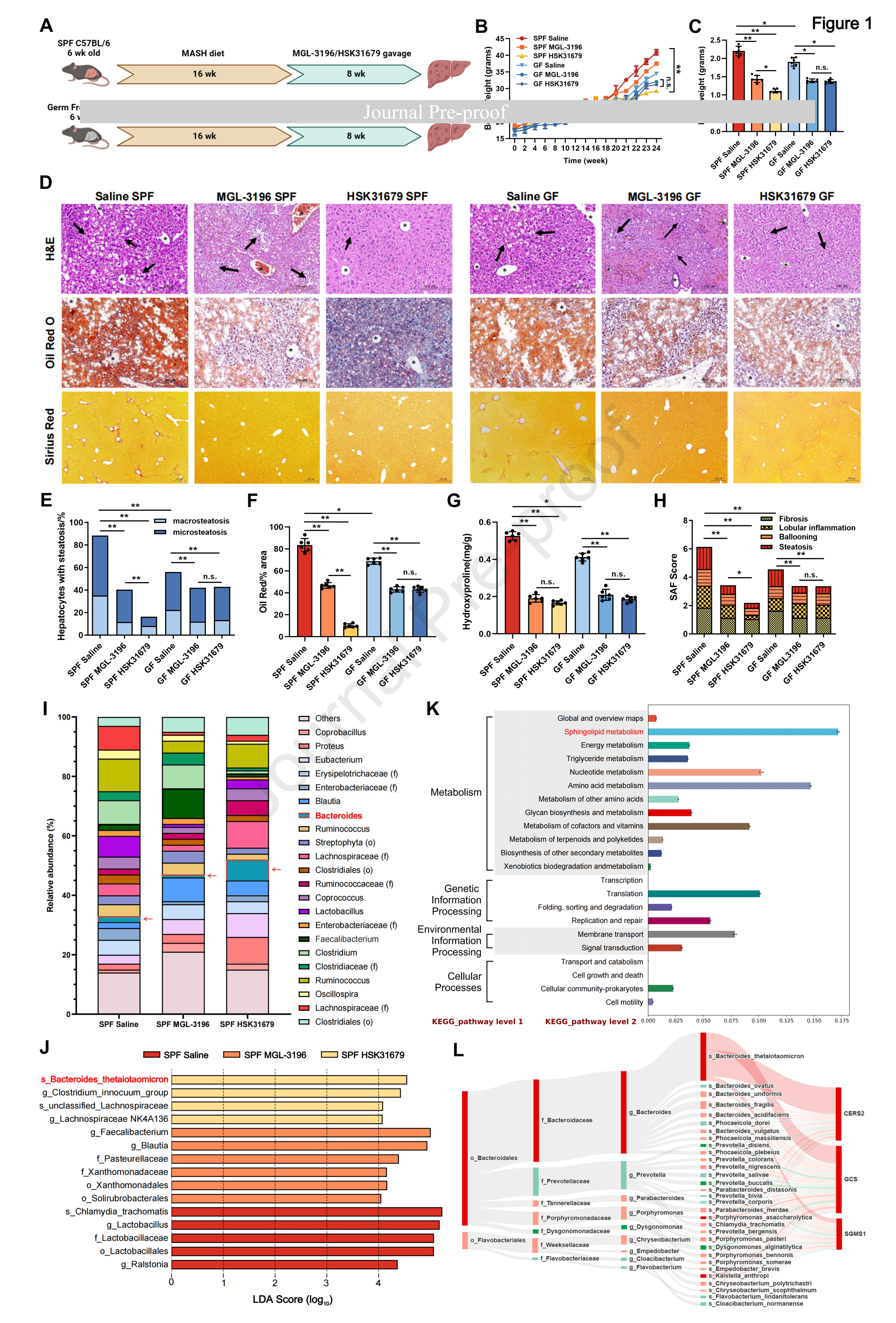 圖1-HSK31679在改善MASH飲食誘導的SPF小鼠脂肪性肝炎方面優(yōu)于MGL-3196,但在改善GF小鼠方面則不然