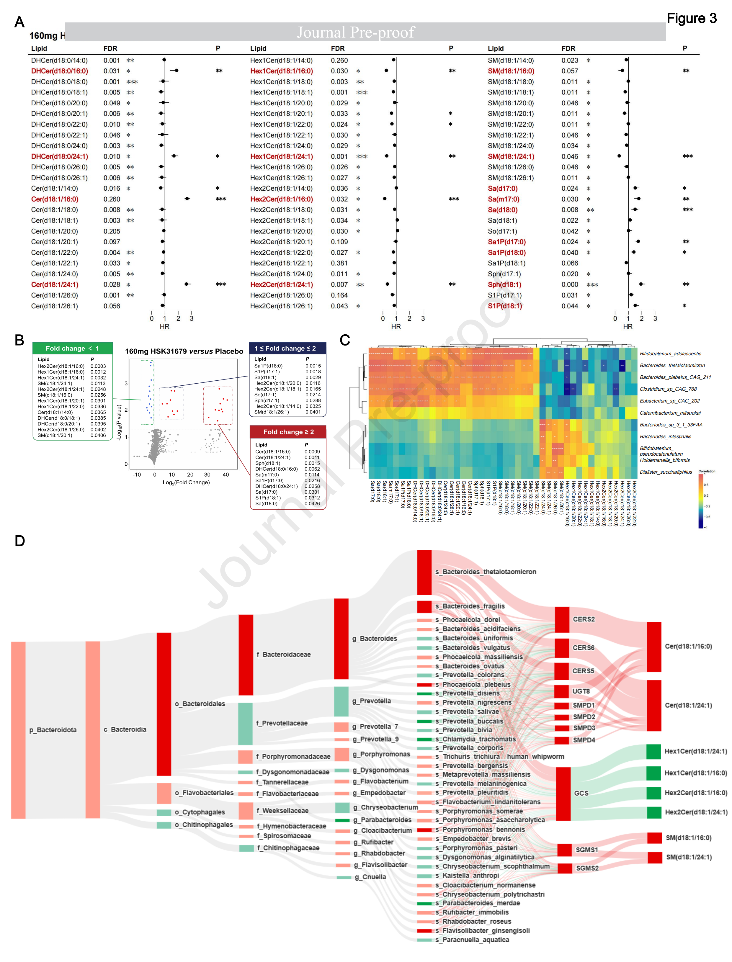 基于 B. thetaiotaomicron?的 SLs 可以轉(zhuǎn)移以調(diào)節(jié)肝臟脂肪變性這一認識,隨后研究者試圖確定 HSK31679 314 治療是否已深入調(diào)節(jié) SLs 表型。對接受多次遞增劑量 HSK31679 316 和安慰劑治療的參與者的糞便代謝物進行脂質(zhì)組學分析,發(fā)現(xiàn)?HSK31679 治療顯著降低了腸道 B. thetaiotaomicron?產(chǎn)生的鞘脂類物質(zhì)(如 Hex1Cer 和 Hex2Cer)的單糖基化程度。