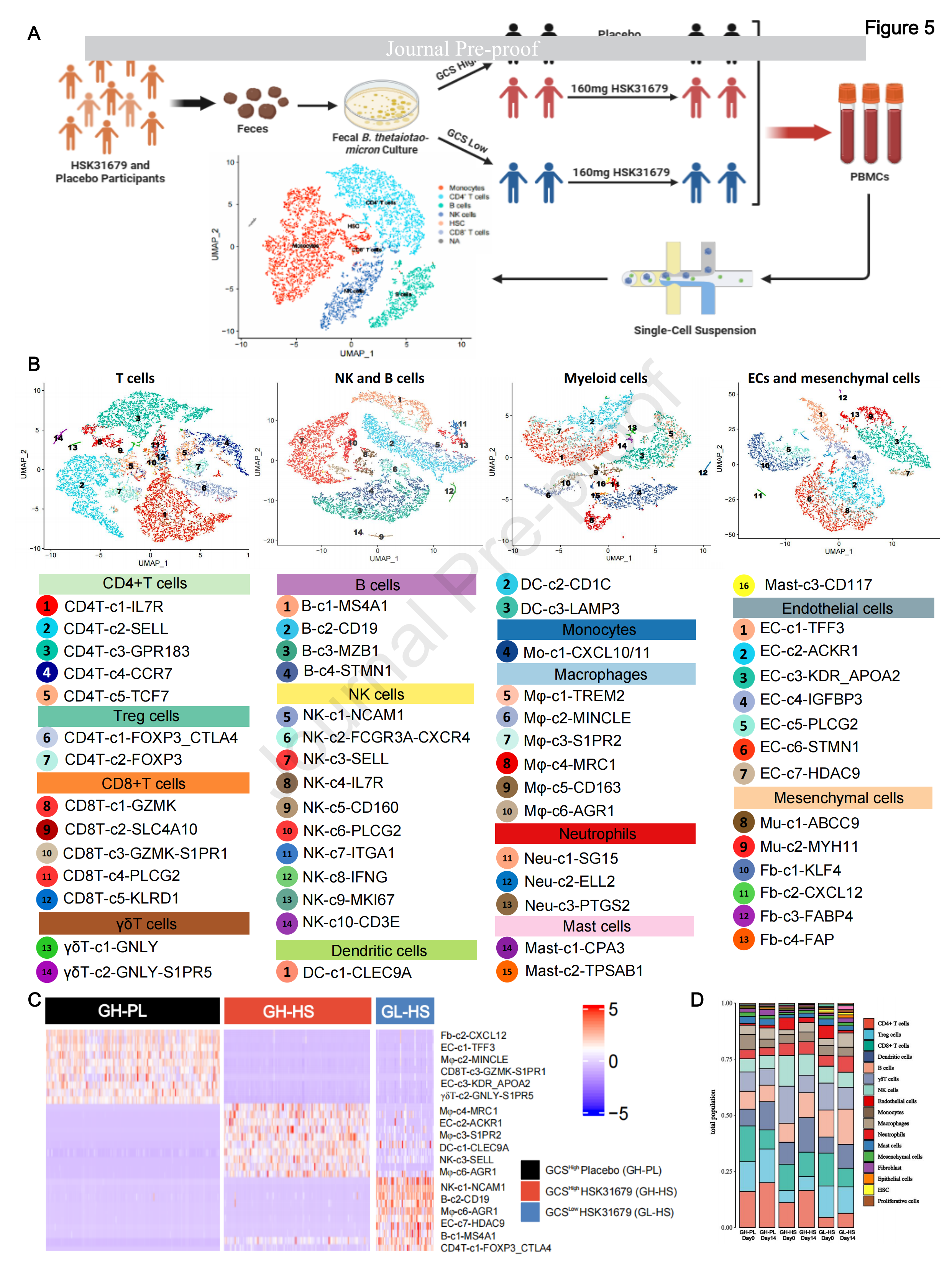 為了深入了解腸道微生物GCS在所有免疫細胞群中治療HSK31679的獨特免疫作用,研究者使用基于液滴的單細胞平臺(10×Genomics Chromium)進行了單細胞轉(zhuǎn)錄組測序(scRNA-seq),分析了來自參與者隊列的18個外周血單核細胞(PBMC)樣本,包括3個用安慰劑(GH-PL)治療的糞便來源GCS高活性樣本、3個用160 mg HSK31679(GH-HS)治療的糞便來源GCS高活性樣本,和GCS低活性樣本(GL-HS)分別在第0天和第14天。從GH-PL、GH-HS、GL-HS數(shù)據(jù)集中獲得的128031個細胞中,共鑒定出57個細胞簇。通過SingleR v.1.0獲得的基于標記的注釋,定義了四種主要的細胞類型:T細胞、自然殺傷細胞(NK)和B細胞、髓系細胞、內(nèi)皮細胞(EC)和間充質(zhì)細胞(圖5B)。通過計算觀察到的細胞數(shù)與預期細胞數(shù)的比值(Ro/e)來量化主要細胞團相對不同的富集情況,發(fā)現(xiàn)髓系細胞團構(gòu)成了GH-HS的主要改變的細胞成分,B細胞、EC團主導了GL-HS樣本的細胞成分(圖5C、D和圖S8C)。鑒于如上所述,HSK31679治療通過B.thetaiotaomicron的GCS減輕了脂肪性肝炎,在隨后分析GH-HS和GL-HS之間的特定細胞區(qū)室時重點研究了髓系細胞。