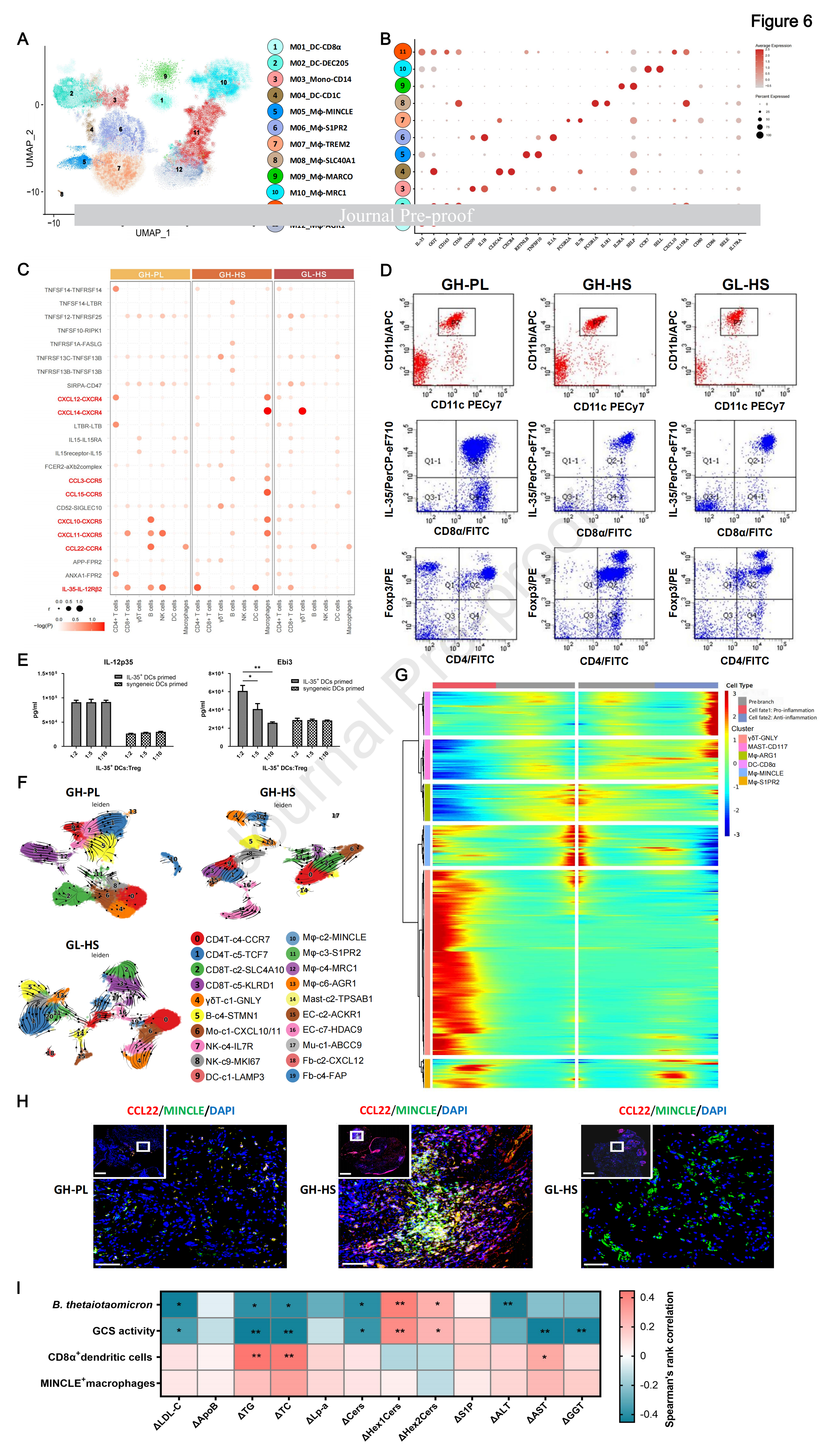 對于巨噬細胞部分,通過無監(jiān)督聚類產(chǎn)生了6個具有不同基因特征的聚類。對兩個富含非經(jīng)典單核細胞簇的PBMCs進行了表征:MINCLE+Mφ和S1PR2+Mφ。根據(jù)常規(guī)表型標記物(TREM2+、MRC1+、CD163+、AGR1+)的高表達,其余簇均被鑒定為巨噬細胞(圖6A)。值得注意的是,巨噬細胞簇MINCLE+Mφ、S1PR2+Mφ和AGR1+Mφ顯示出相對不同的發(fā)展(圖6F、G)。在這些巨噬細胞簇中,AGR1+Mφ和MINCLE+Mφ是GH-HS和GL-HS組中改變的主要亞群,而S1PR2+Mφ在GH-HS組更具特征(圖5C)。然后研究了它們的不同功能狀態(tài),并觀察到趨化因子(CCL3/15和CXCL10/12/14)在GH-HS中的表達降低,但在GL-HS樣本中沒有,這表明其是由這些Mφ簇募集T細胞的過程。GH-HS樣本的細胞相互作用分析也證實,抗炎巨噬細胞通過CCL3/15-CCR5、CXCL10/11-CXCR5和CXCL12/14-CXCR4信號傳導積極參與T細胞的募集(圖6C和S9B)。在GL-HS組中,MRC1+Mφ表達的CCL15/CXCL10水平升高,AGR1+Mφ高度表達CCL2/CXCL12(圖S9B);而GH-HS組CCL22簇的優(yōu)勢Mφ從MINCLE+Mφ切換(圖6H和S9D),其AGR1+Mφ上調(diào)了RPS27、CDKN1C和KLRF1的表達水平(圖S10B),表明經(jīng)HSK31679處理的糞便來源GCS+參與者的巨噬細胞發(fā)生了重編程??偨Y(jié)HSK31679治療的上述代謝指標,GCS活性和糞便中B.thetaiotaomicron的相對豐度與肝臟ΔTG、ΔTC和ΔGGT水平等呈顯著負相關(guān)(圖6I)。這些結(jié)果表明,B.thetaiotaomitron介導的免疫抑制的GCS活性可能預測HSK31679治療個體的MASH緩解。