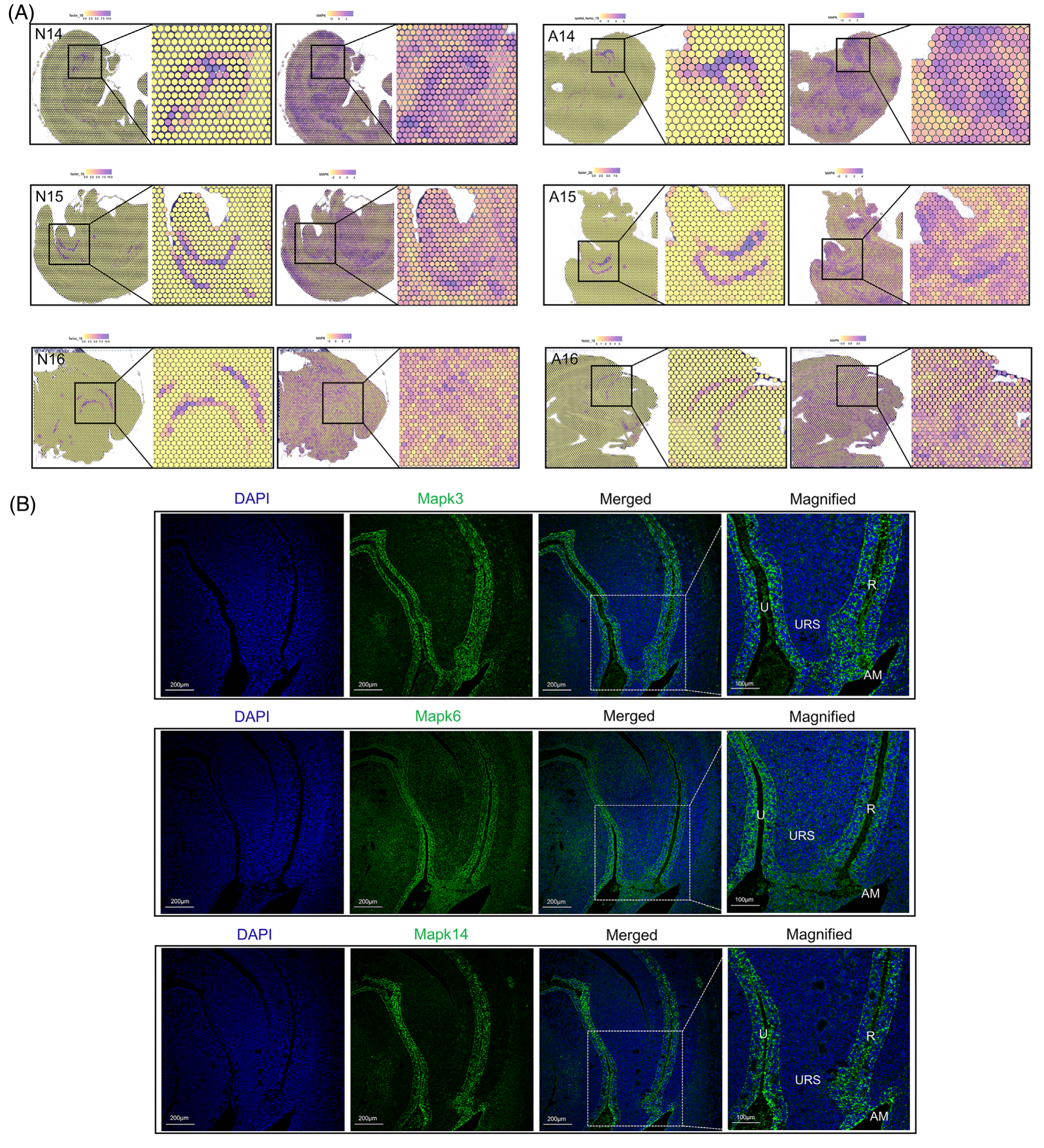 PROGENy 算法用于通過(guò)下游基因表達(dá)的變化評(píng)估信號(hào)通路的活性。作者獲得了正常組和 ARM 組 GDs 14-16 樣本中不同通路的活性水平評(píng)分。在使用 NNMF 對(duì)后腸區(qū)域(N14 因子 16、A14 因子 15、N15 因子 15、A15 因子 20、N16 因子 18 和 A16 因子 10)進(jìn)行聚類分析中,PROGENy 算法顯示與 MAPK 信號(hào)通路呈強(qiáng)正相關(guān),表明 MAPK 信號(hào)在后腸中顯著富集(圖 3A)。從這些區(qū)域提取來(lái)自 Erk、P38、JNK 和 Erk5 家族的 12 個(gè)成員分子的定位表達(dá)模式。具體來(lái)說(shuō),Mapk3 、 Mapk6 和 Mapk14 主要富集在泄殖腔區(qū)域。這些蛋白質(zhì)的免疫熒光驗(yàn)證證實(shí)了它們?cè)谀虻篮秃竽c區(qū)域的特異性表達(dá),在 URS 和間質(zhì)區(qū)域的表達(dá)相對(duì)較弱,這與 PROGENy 預(yù)測(cè)一致(圖 3B)。