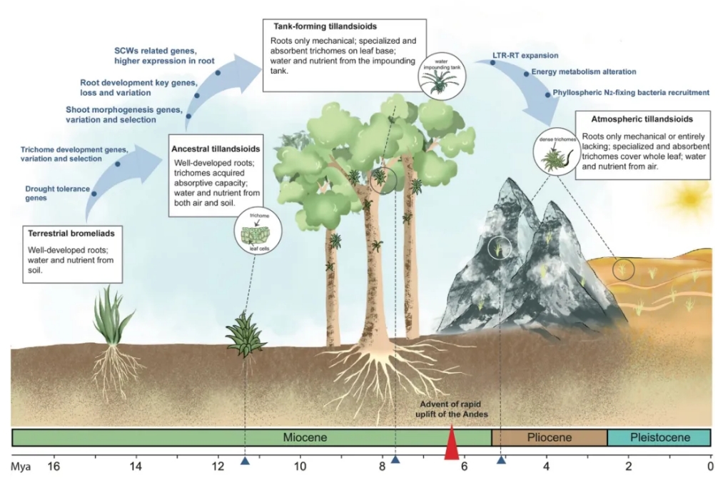 空氣植物的進(jìn)化引發(fā)了幾個(gè)值得思考的問(wèn)題:它們是何時(shí)、何地從陸生環(huán)境轉(zhuǎn)向空中棲息地的?是什么驅(qū)動(dòng)了這一轉(zhuǎn)變?空氣植物失去根部功能的遺傳基礎(chǔ)是什么?葉片上的特殊毛狀體是如何代替根部執(zhí)行吸收功能?最重要的是,它們?nèi)绾卧诳罩协h(huán)境中獲取必需的營(yíng)養(yǎng)物質(zhì)?