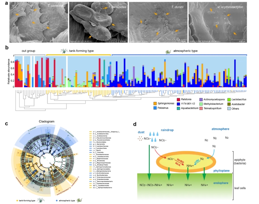 在解決了水分吸收問(wèn)題后,另一個(gè)對(duì)空氣植物生存至關(guān)重要的問(wèn)題是養(yǎng)分問(wèn)題。研究人員通過(guò)16S rRNA測(cè)序和宏基因組分析,發(fā)現(xiàn)空氣鳳梨葉表附生了大量固氮細(xì)菌(圖7a),且這些細(xì)菌具有特異性,特別是1174-901-12屬細(xì)菌,專一性地附生在空氣鳳梨的葉表,并且在細(xì)菌類群中占據(jù)主要地位,可能與空氣鳳梨共進(jìn)化(圖7b-c)。此外,固氮酶nifA和nifH的發(fā)現(xiàn)進(jìn)一步證實(shí)了這些細(xì)菌的固氮能力(圖7d)。這些固氮細(xì)菌可能成為空氣植物的主要氮源,尤其在營(yíng)養(yǎng)匱乏的空中環(huán)境中尤為重要。