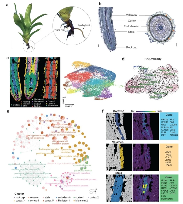 空氣鳳梨的根部功能顯著退化,主要僅發(fā)揮機(jī)械“固著”作用或完全缺失。通過(guò)基因組和比較基因組分析(圖3a-e),研究人員發(fā)現(xiàn)與根發(fā)育相關(guān)的關(guān)鍵基因(如SCR、WER、TTG1、JKD)在附生鳳梨類群中發(fā)生了快速進(jìn)化,并受到選擇固定(圖3i-j)。與側(cè)根發(fā)育相關(guān)的AR1基因家族則出現(xiàn)顯著收縮。與根系響應(yīng)重力的關(guān)鍵基因ARG1丟失,而負(fù)調(diào)控基因WG2則受到正向選擇。同時(shí),根系對(duì)水分響應(yīng)的關(guān)鍵基因EN1也發(fā)生喪失。這些結(jié)果表明,空氣植物的進(jìn)化適應(yīng)增強(qiáng)了它們?cè)诖髿馍鷳B(tài)位中的生存能力。此外,利用相同的方法,研究人員還找到了空氣鳳梨耐旱的基因組適應(yīng)性進(jìn)化的關(guān)鍵基因(圖3f-g)和積水類型鳳梨蓄水槽形成的關(guān)鍵基因AS1的變異選擇(圖3h)。此外,研究人員通過(guò)空間轉(zhuǎn)錄組分析發(fā)現(xiàn),與次生細(xì)胞壁合成相關(guān)的多個(gè)基因在根被和皮層組織中表現(xiàn)出快速表達(dá),為根系在生長(zhǎng)過(guò)程中迅速木質(zhì)化并發(fā)揮機(jī)械“固著”作用提供了分子基礎(chǔ)(圖4)。