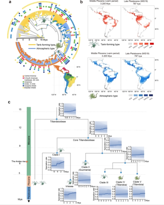 為了追溯空氣鳳梨的起源,研究人員廣泛收集了覆蓋空氣鳳梨亞科(Tillandsioideae)78%屬的植物,利用轉(zhuǎn)錄組測(cè)序獲得低拷貝基因的91個(gè)核基因,構(gòu)建了空氣鳳梨亞科植物系統(tǒng)發(fā)育樹(圖1)。然后通過(guò)祖先重建和分子鐘計(jì)算,發(fā)現(xiàn)核心空氣鳳梨亞科植物起源于11.3百萬(wàn)年前的安第斯山脈,祖先類型為積水型鳳梨(圖2a)。大約在6百萬(wàn)年前,安第斯山脈快速隆起,推動(dòng)了物種的分化,完全大氣生的空氣鳳梨出現(xiàn),這些植物通常被稱為“air plants”。地球氣候世代的轉(zhuǎn)變也加速了物種的分化(圖2b-c)。
