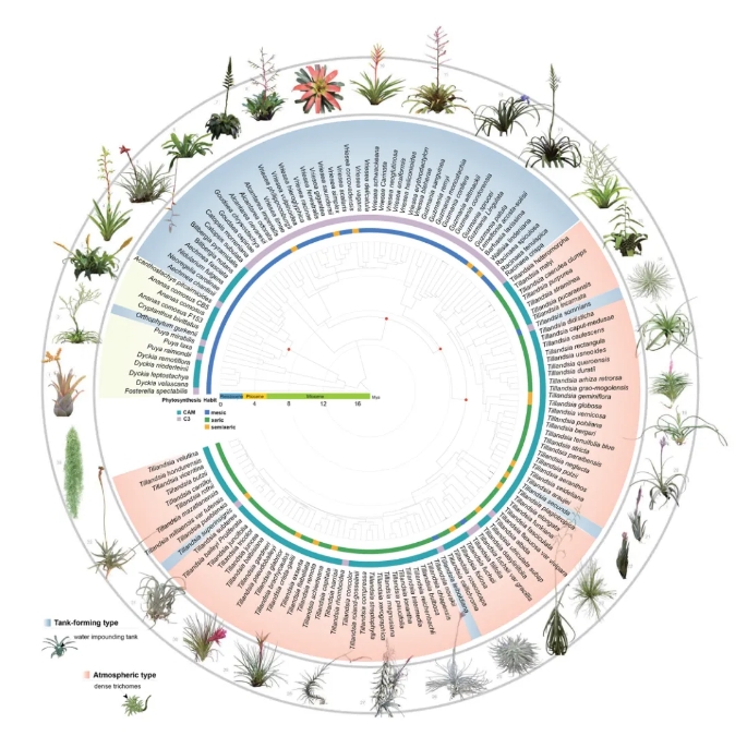 近日,浙江大學(xué)農(nóng)學(xué)院張明方/喻景權(quán)團(tuán)隊(duì)聯(lián)合上海辰山植物園等單位,在Nature Communications期刊上發(fā)表了題為Tracing the evolutionary and genetic footprints of atmospheric tillandsioids transition from land to air的研究成果。該研究采用多組學(xué)方法,解析了空氣鳳梨的起源與進(jìn)化時(shí)間、地點(diǎn),探討了推動(dòng)其進(jìn)化的動(dòng)力學(xué)因素,并揭示了其獨(dú)特適應(yīng)性器官特征的遺傳基礎(chǔ),以及在空中環(huán)境中獲取營(yíng)養(yǎng)的生存策略。