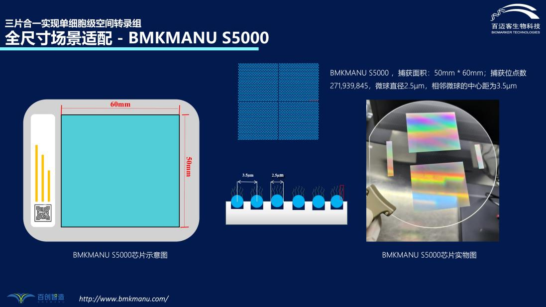 隨著百邁客生物在時(shí)空組學(xué)領(lǐng)域的不斷探索,在保證具備亞細(xì)胞分辨率的條件下,研究團(tuán)隊(duì)已成功完成了全尺寸場(chǎng)景適配捕獲芯片BMKMANU S5000的研發(fā)與測(cè)試。捕獲面積:50mm*60mm;捕獲位點(diǎn)數(shù):271,939,845;微球直徑:2.5μm;相鄰微球的中心距為3.5μm。該產(chǎn)品的推出大大降低了空間轉(zhuǎn)錄組實(shí)驗(yàn)對(duì)樣本尺寸的限制,將更大程度地滿足當(dāng)前科研需求。