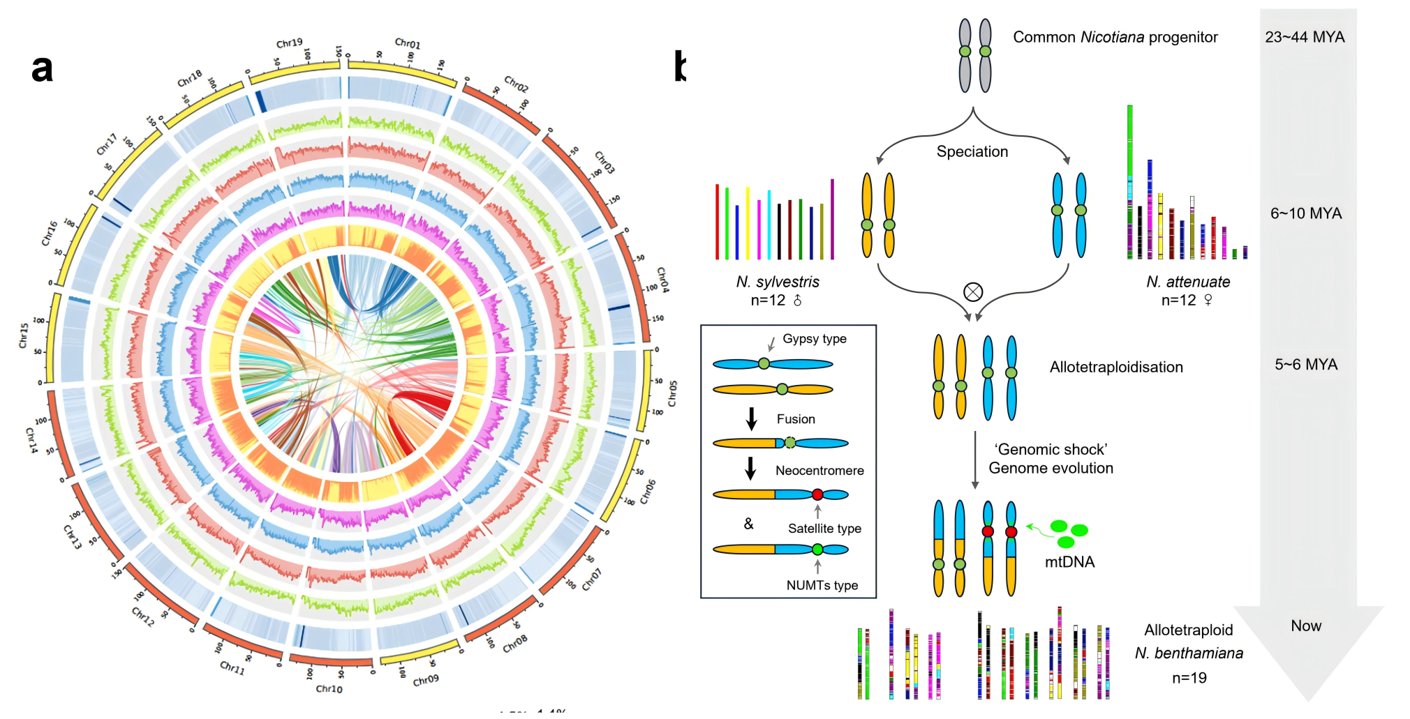 本氏煙草(Nicotiana benthamiana)是一年生茄科煙草屬植物,原產(chǎn)于澳大利亞北部地區(qū),和用于制作香煙的普通煙草(N. tabaccum)是近緣物種。本氏煙草最為人知的是作為植物學(xué)和合成生物學(xué)研究的模式植物。本氏煙草憑借其對病毒的易感性和在瞬時基因表達(dá)的便利性成為了植物科學(xué)家的“寵兒”,同時它也是植物天然產(chǎn)物和疫苗異源合成的重要底盤生物。因此,解析本氏煙草的基因組密碼對促進(jìn)植物科學(xué)研究和生物制藥產(chǎn)業(yè)具有重要的價值。本氏煙草是異源四倍體,由兩個二倍體祖先在距今500萬年-600萬年雜交形成,之后基因組演化形成現(xiàn)今的19對染色體。本氏煙草基因組約為2.85Gb,其草圖最早發(fā)表于2012年,之后的12年間多個改進(jìn)版本的本氏煙草基因組陸續(xù)公布,組裝質(zhì)量有了很大提升,但仍然存在多個缺口與組裝注釋錯誤,嚴(yán)重影響了對這一模式生物的功能基因組學(xué)的研究進(jìn)程。