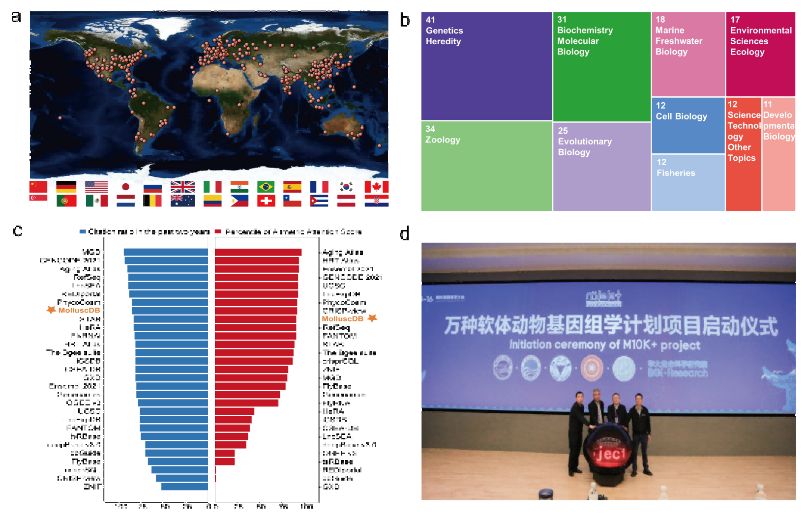 圖1-MolluscDB數(shù)據(jù)庫國際影響力(a: 訪問國家;b: 引文領(lǐng)域;c: 數(shù)據(jù)庫排名;d: 國際M10K計劃啟動)
