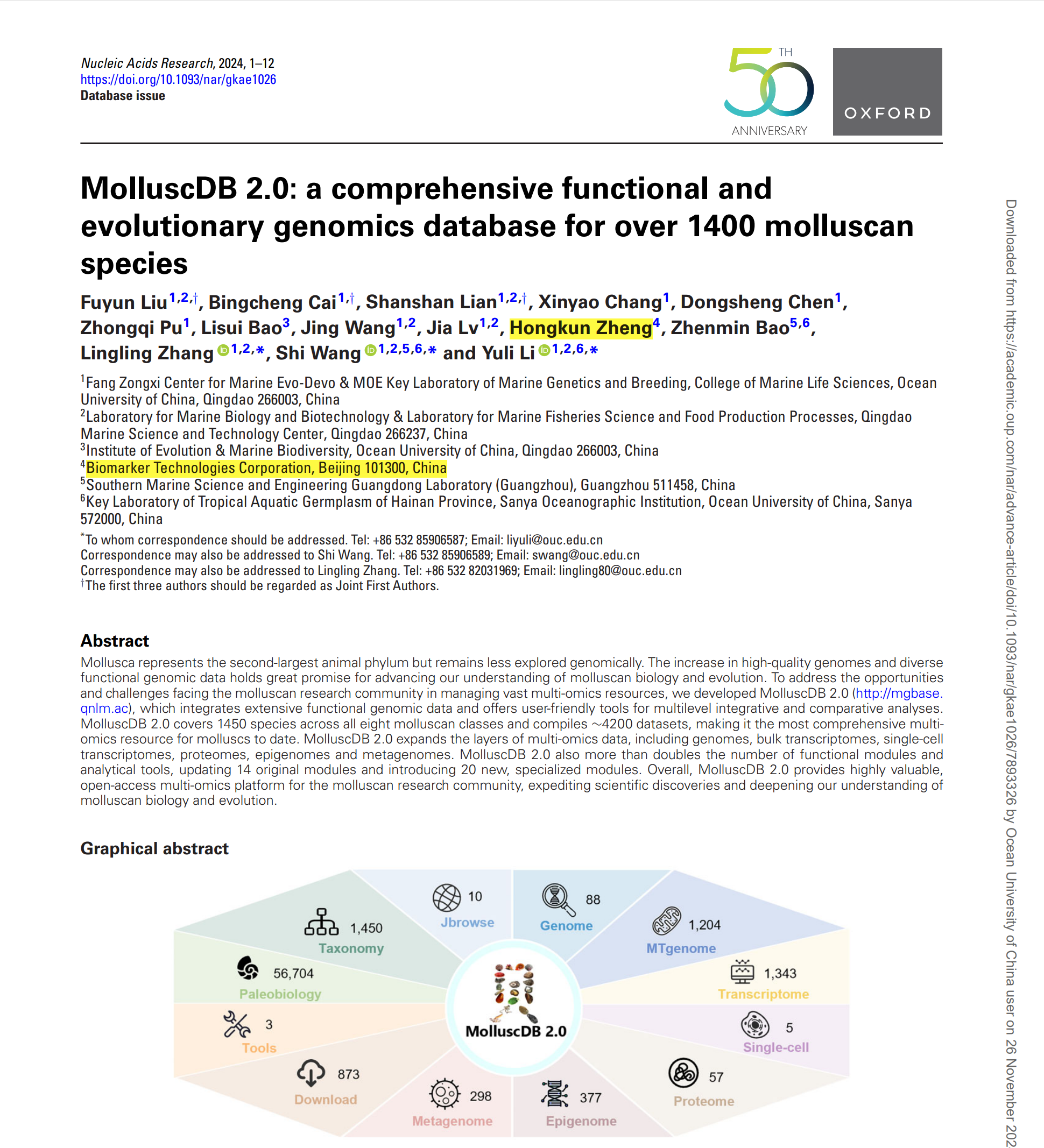 中國海洋大學(xué)“海洋生物遺傳學(xué)與育種”教育部重點實驗室、方宗熙海洋生物進化與發(fā)育中心包振民院士和王師教授團隊在國際生物信息數(shù)據(jù)庫領(lǐng)域頂刊Nucleic Acids Research在線發(fā)表了軟體動物功能和進化基因組學(xué)綜合數(shù)據(jù)庫“MolluscDB 2.0: a comprehensive functional and evolutionary genomics database for over 1400 molluscan species”(MolluscDB 2.0:面向超過1400個軟體動物種類的功能和進化基因組學(xué)綜合數(shù)據(jù)庫)。
