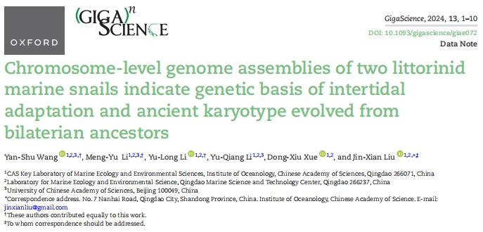 海洋所劉進賢課題組發(fā)布了西北太平洋巖相潮間帶兩種常見濱螺科生物——短濱螺和中華濱螺高質(zhì)量染色體水平基因組參考序列,并基于比較基因組學(xué)分析探究了濱螺科生物適應(yīng)多變巖相潮間帶環(huán)境的分子機制,推演了由兩側(cè)對稱動物祖先到濱螺的核型演變歷程,相關(guān)研究結(jié)果發(fā)表于國際期刊GigaScience。