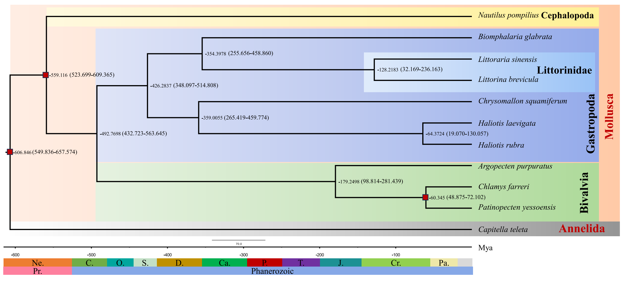 通過比較基因組學(xué)分析構(gòu)建了包括兩種濱螺在內(nèi)的11個物種的系統(tǒng)發(fā)育樹,并估算兩種濱螺的分化時間大約在128.22Mya前。進一步的研究結(jié)果表明與刺激反應(yīng)、代謝過程、先天免疫和抗氧化反應(yīng)相關(guān)的基因或基因家族可能在濱螺應(yīng)對潮間帶多種環(huán)境因子脅迫的過程中發(fā)揮著重要作用,受損核酸和蛋白的修復(fù)或降解可能是濱螺在多重壓力下抵抗細胞凋亡、維持細胞內(nèi)穩(wěn)態(tài)的主要方式。相關(guān)研究結(jié)果為潮間帶無脊椎動物適應(yīng)性進化分子機制的后續(xù)研究提供了基礎(chǔ)。