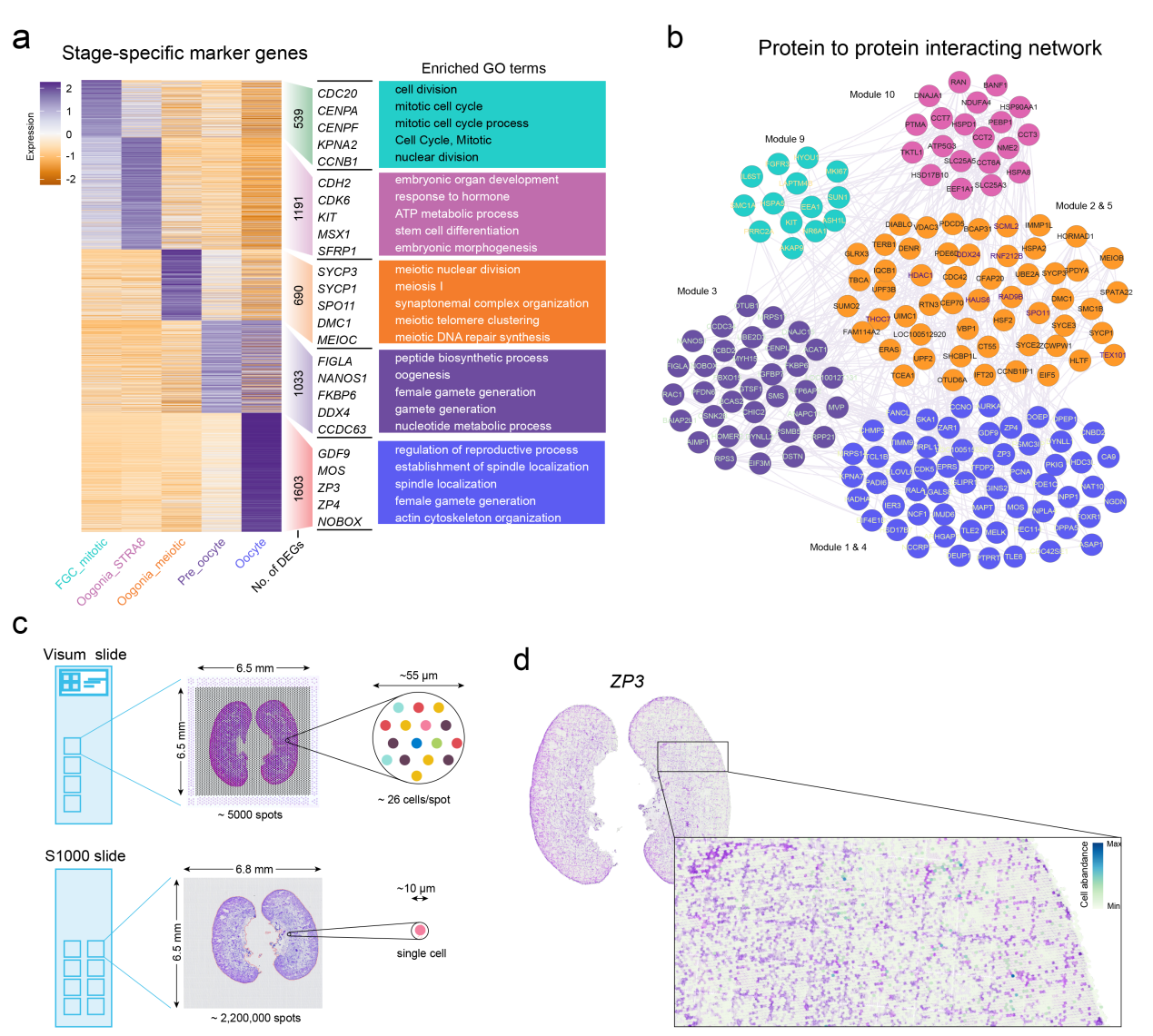 為了進(jìn)一步驗證分析,研究人員還在同一E65卵巢組織上使用了更高分辨率(BMKMANU S1000;Spot點(diǎn)大小約為10微米)的平臺進(jìn)行了ST測序。結(jié)果與E65時的Visium ST解卷積一致,使用S1000平臺在E65時可視化ZP3陽性卵母細(xì)胞的空間位置也證實了其在內(nèi)皮層的表達(dá)。