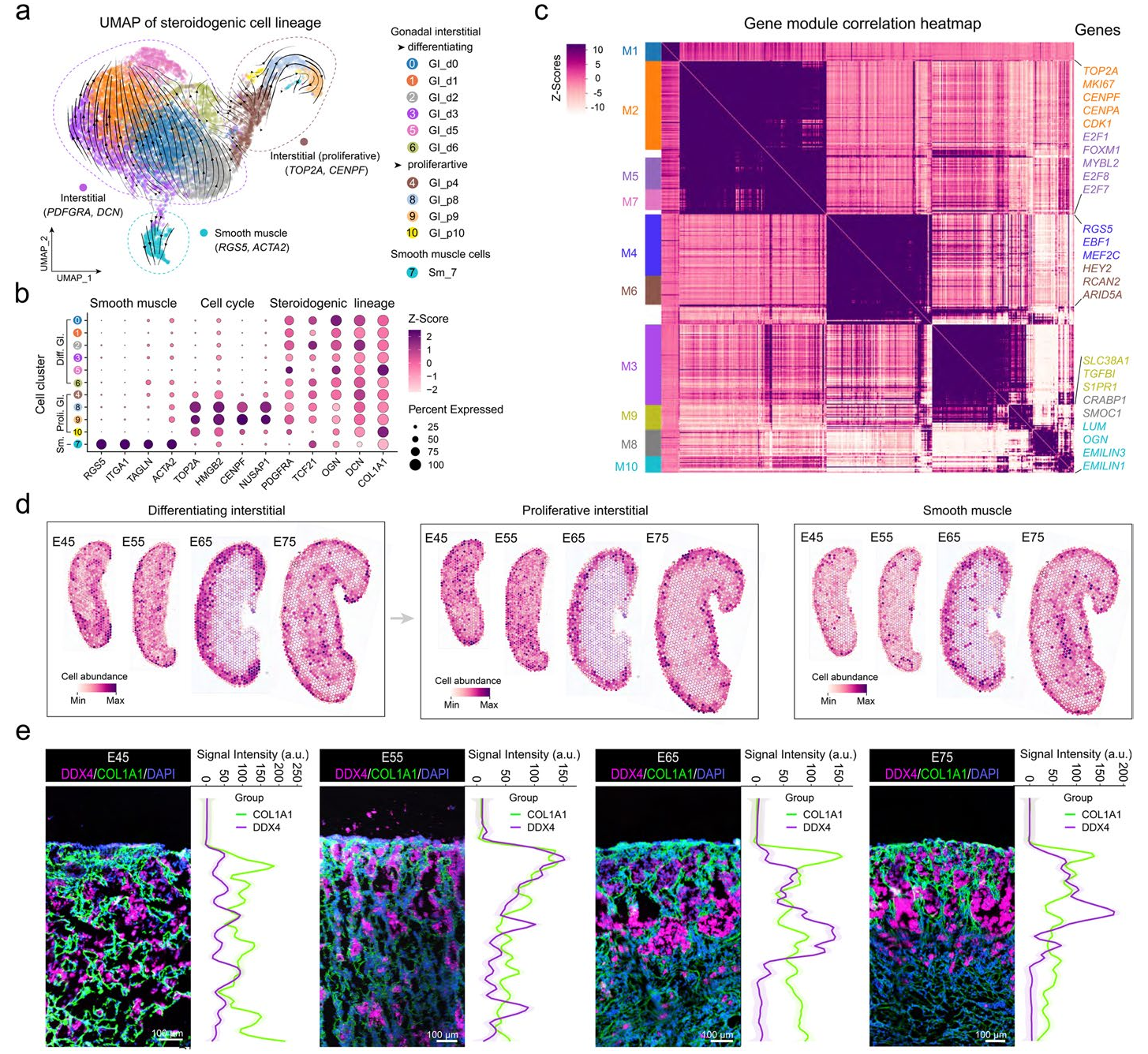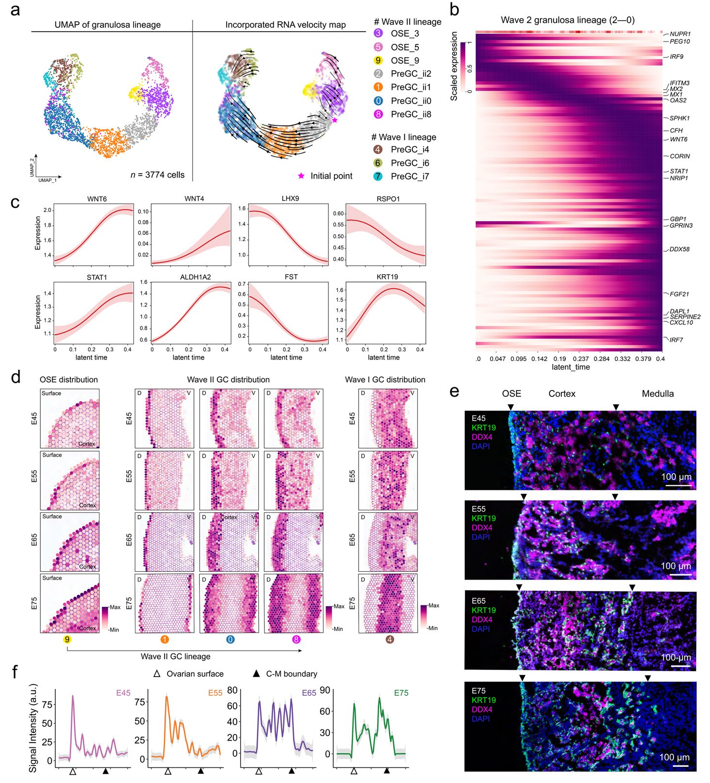 研究方法:scRNA-seq(E45、E55、E65、E75胚胎卵巢,共計18,956個高質(zhì)量細(xì)胞,10x Genomics Chromium);空間轉(zhuǎn)錄組(E45、E55、E65、E75胚胎卵巢,10x Visium;E65胚胎卵巢,BMKMANU S1000)