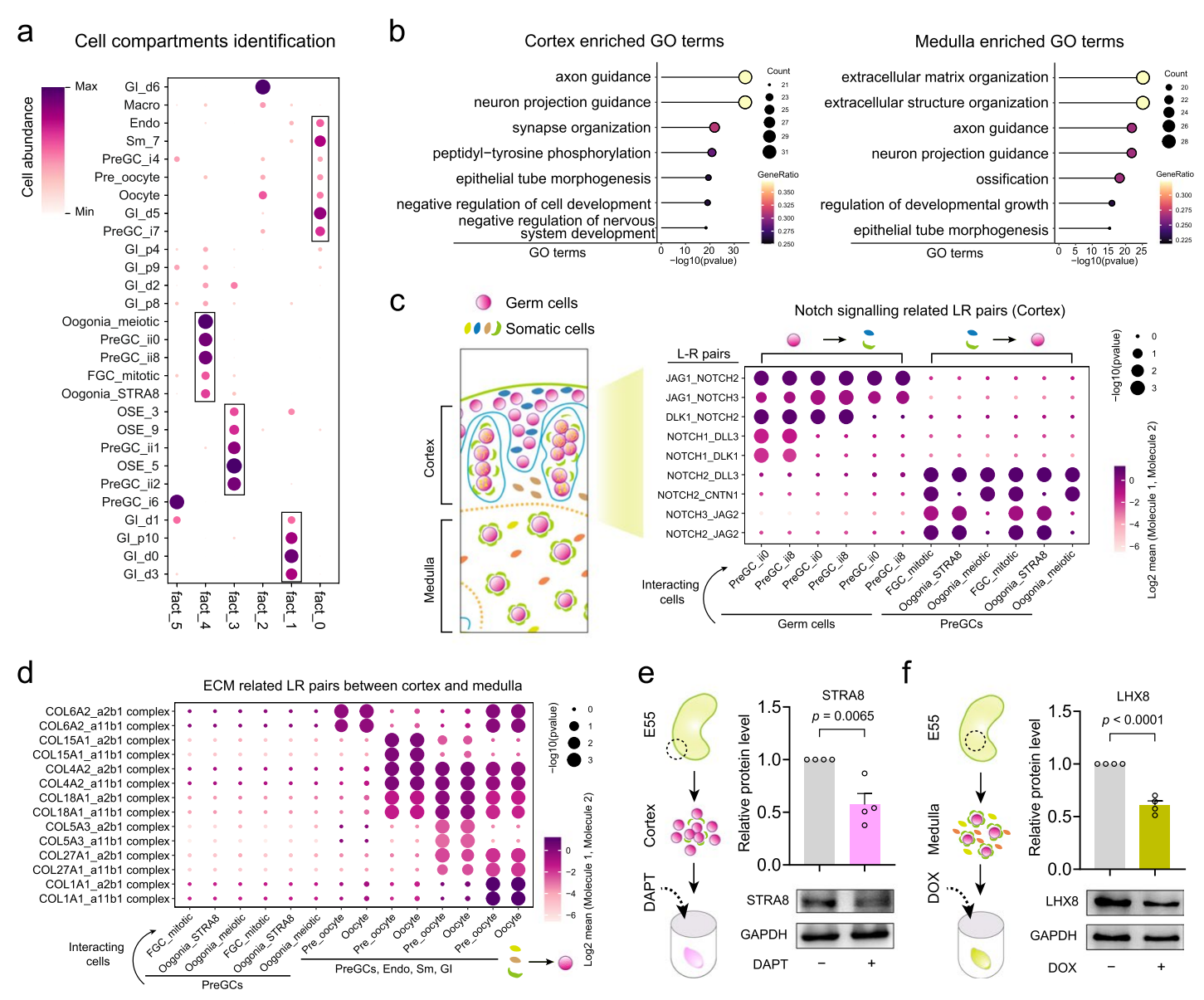 為了進(jìn)一步驗證細(xì)胞通訊分析,研究人員接下來探討了在使用從E55卵巢皮質(zhì)和髓質(zhì)中分離的卵巢組織進(jìn)行體外條件下,補(bǔ)充NOTCH信號抑制劑DAPT和基質(zhì)金屬蛋白酶抑制劑多西環(huán)素是否會影響生殖細(xì)胞命運(yùn)。從E55胎兒卵巢中解剖出皮質(zhì)和髓質(zhì)組織,將這些組織進(jìn)行體外培養(yǎng),并在用DAPT處理10天后觀察到皮質(zhì)卵巢組織中減數(shù)分裂標(biāo)志物STRA8的表達(dá)水平顯著降低,而髓質(zhì)卵巢組織則沒有這種情況。相反,在用基質(zhì)金屬蛋白酶抑制劑多西環(huán)素處理10天后,觀察到卵泡形成標(biāo)志物L(fēng)HX8的表達(dá)水平降低,而在皮質(zhì)組織中未觀察到可比的影響。綜上所述,這些數(shù)據(jù)進(jìn)一步支持了在空間背景下的細(xì)胞-細(xì)胞通訊分析,并強(qiáng)調(diào)了卵巢微環(huán)境在調(diào)節(jié)生殖細(xì)胞命運(yùn)中的重要作用。