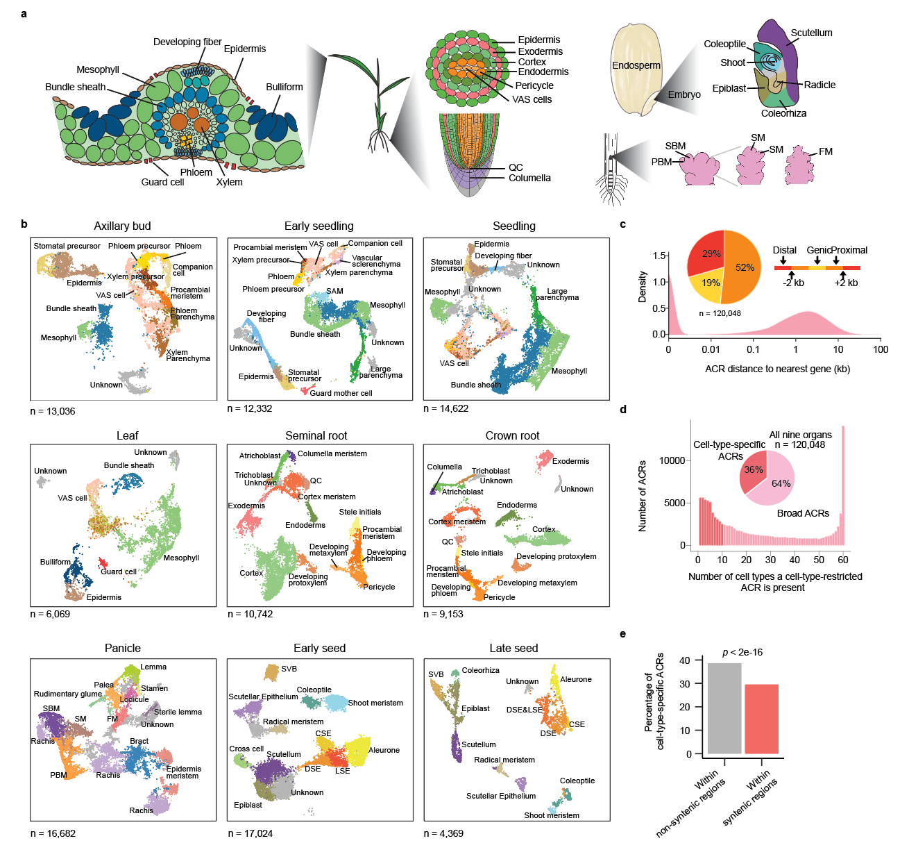 ② 該研究構(gòu)建了一個(gè)全面的水稻(Oryza sativa)染色質(zhì)可及性單細(xì)胞圖譜,整合了來自103,911個(gè)細(xì)胞核、代表126種離散細(xì)胞狀態(tài)的九個(gè)不同器官的數(shù)據(jù)。通過比較基因組學(xué),分析了水稻與另外四種禾本科植物(玉米?Zea mays、高粱?Sorghum bicolor、黍?Panicum miliaceum?和?Urochloa fusca)中57,552個(gè)細(xì)胞核的細(xì)胞類型分辨染色質(zhì)可及性之間的差異。
