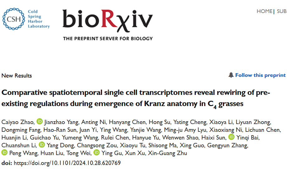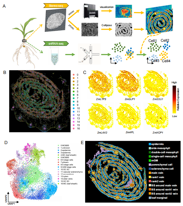 ② 該研究通過比較轉(zhuǎn)錄組學(xué)的方法,結(jié)合玉米(Zea mays)葉原基的單細(xì)胞空間轉(zhuǎn)錄組數(shù)據(jù),以及三種C4植物(玉米、高粱、狗尾草)和一種C3植物(水稻)對(duì)應(yīng)葉組織的單細(xì)胞RNA測序(scRNA-seq)圖譜,研究了Kranz解剖結(jié)構(gòu)發(fā)育和演化過程中涉及的調(diào)控網(wǎng)絡(luò)。