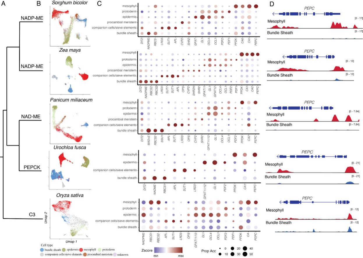 ② 該研究使用單細(xì)胞sci-ATAC-seq來鑒定與C4酶相關(guān)的特異細(xì)胞類型的可及染色質(zhì)區(qū)域(ACRs),研究涵蓋了五種不同的禾本科植物,包括四種C4植物和一種C3植物。其中,C4植物分屬三種不同的光合亞型:玉米(Zea mays)和高粱(Sorghum bicolor)屬于NADP-ME亞型;黍(Panicum miliaceum)屬于NAD-ME亞型;Urochloa fusca屬于PEPCK亞型;C3植物水稻(Oryza sativa)