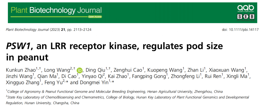PSW1編碼一個LRR – RLK蛋白激酶,等位基因PSW1HapII賦予了PSW1更高的表達水平和對其輔助受體AhBAK1更強的親和力,以上調(diào)PSW1 – based途徑,調(diào)節(jié)花生莢果大小。此外,PSW1HapII的過表達增加了多種植物的種子/果實大小。